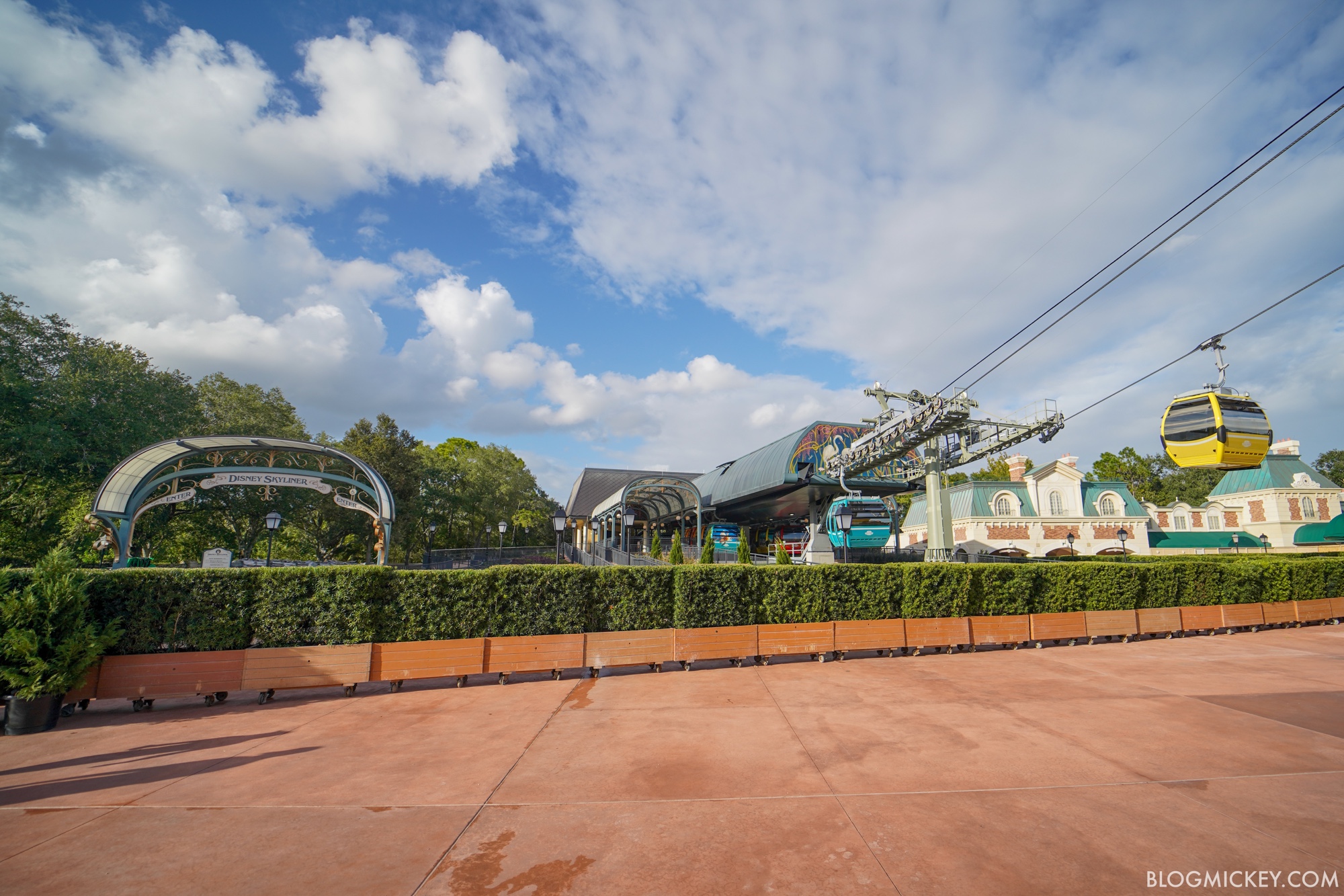 The remaining construction walls have come down at the Epcot Disney Skyliner station. The walls have been replaced by roll away planters – see in the photos below.
