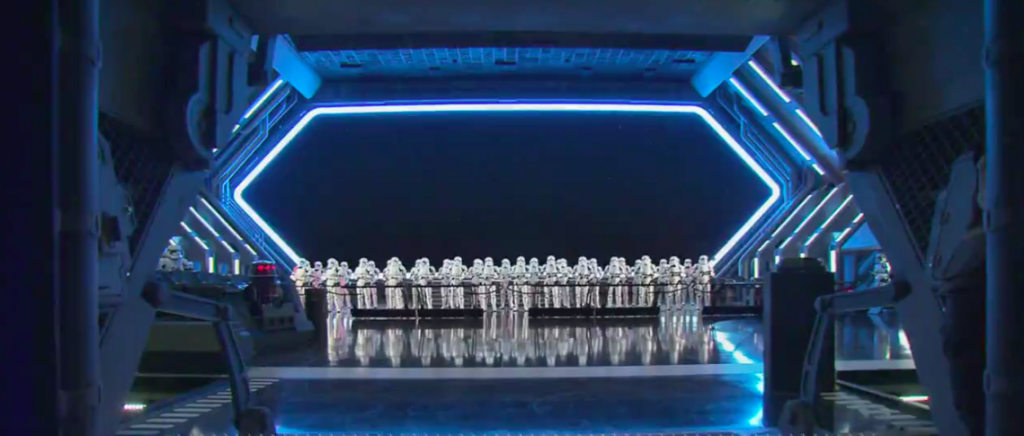 The sneak peek shows the same kind of elements we’ve seen before, including Poe Darmeron’s X-wing and an army of Stormtroopers lurking in the hanger bay of a Star Destoryer.