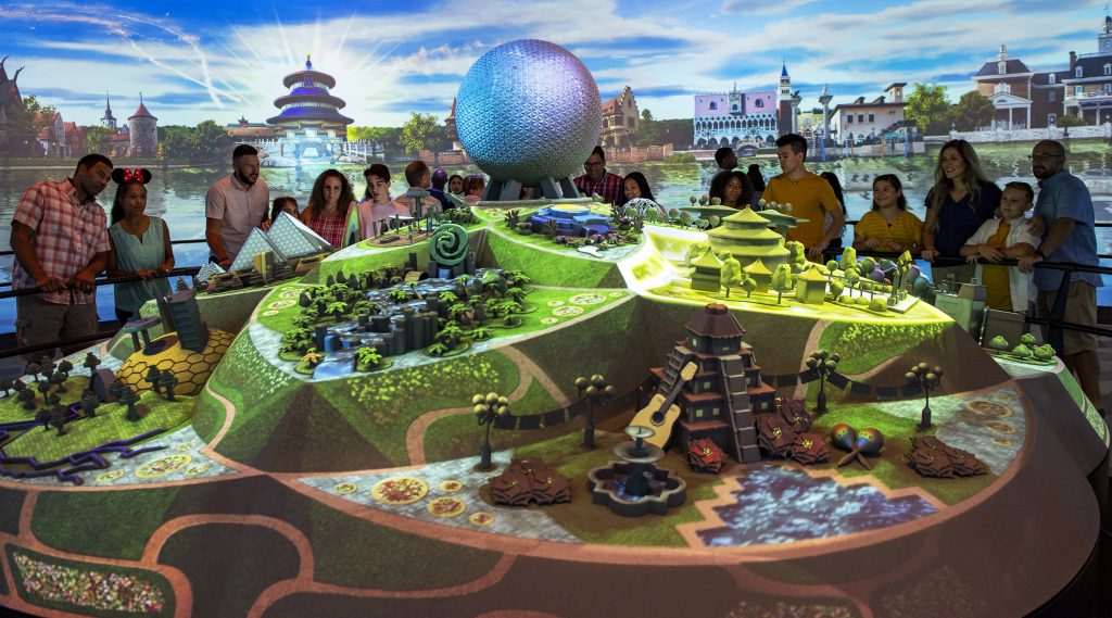 All the while, a 3D artfully designed model in the center of the room appears to change in time with the film, as projection-mapping technology highlights different areas of the park in magical ways.