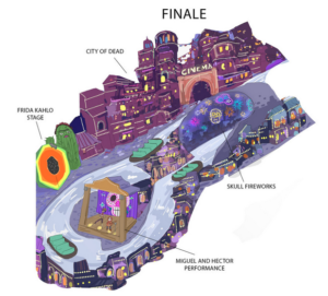 Once you enter the City of Dead, which would be the Small World Room, you would be surrounded by skeletons and characters from the movie. The finale of the ride would be Hector and Miguel on stage singing Remember Me as you round the corner and make your way towards the unloading station. The concept art for the ride can be found below: