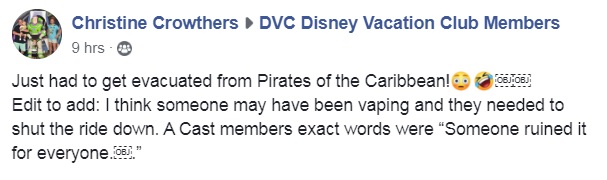 Riders on Pirates of the Caribbean in the Magic Kingdom needed to be evacuated, according to a post made by Christine Crowthers on the Disney Vacation Club Members (DVC) Facebook group.