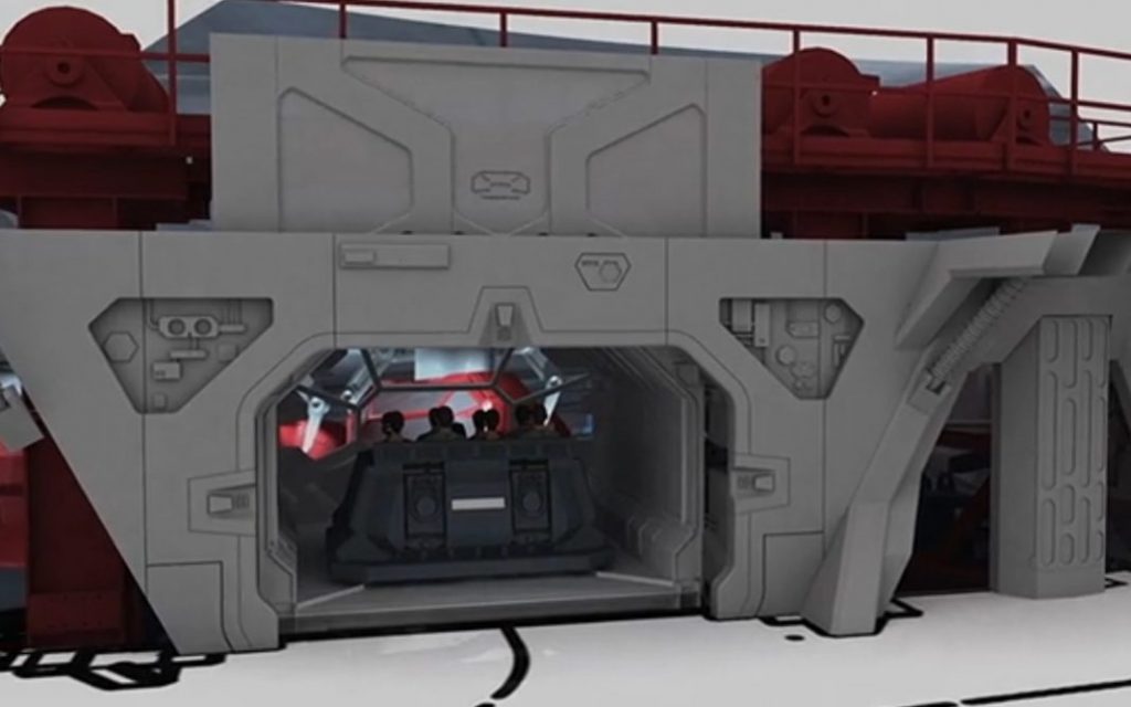 What was born was the idea of the drop thrill that acts as the finale of SW: ROTR. Trowbridge said the team thought about the idea of taking their trackless vehicle and “mounting it to a motion-based experience like Star Tours”.