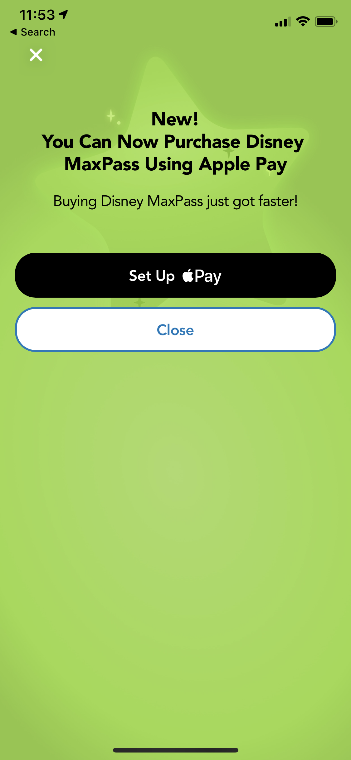 To set up Apple Pay in the Disneyland app, tap the MaxPass button and the popup (see below) will appear.