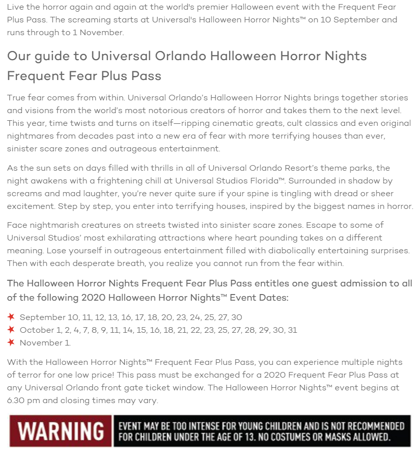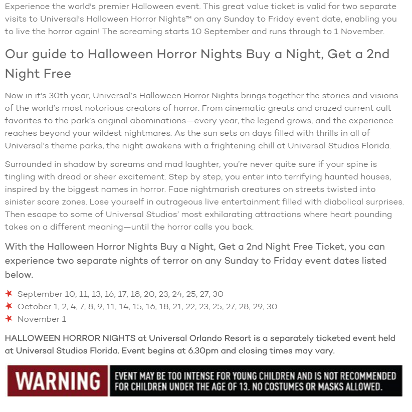 If you’re heading to Universal Orlando (from the UK) for HHN 30, purchase your tickets here. Why? Because they’re great value.