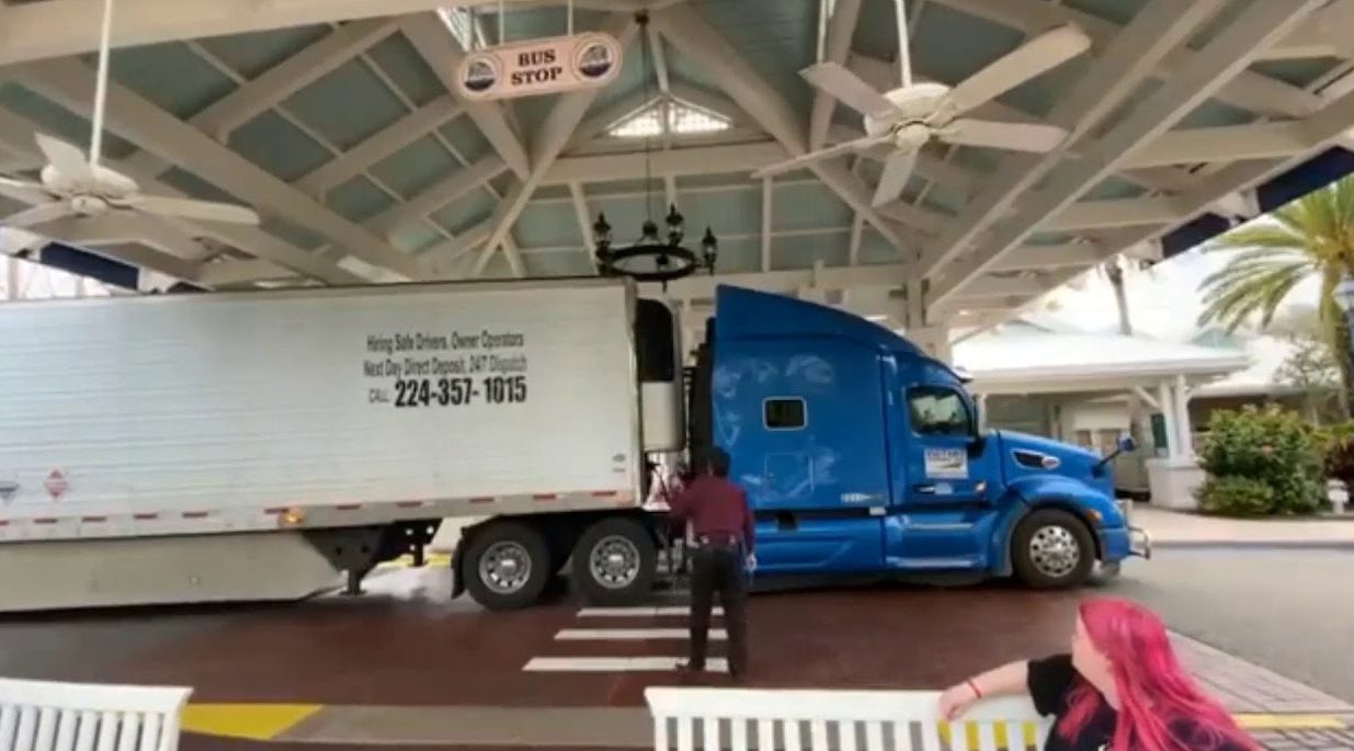 In the video below, watch a semi-truck smack into the ceiling decorations of Disney’s Old Key West Resort (precise location: valet stop canopy) at Walt Disney World.