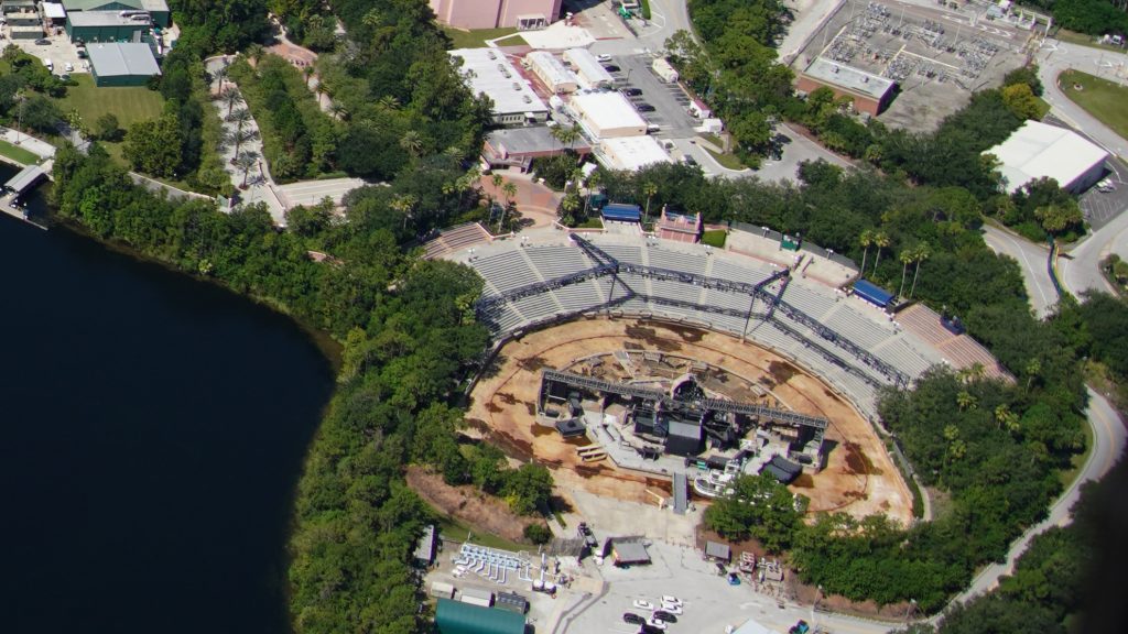 With Walt Disney World nighttime spectaculars temporarily suspended as part of the reopening plan, a new aerial photo has emerged on social media showing the Fantasmic Lagoon at Disney’s Hollywood Studios drained. See below: