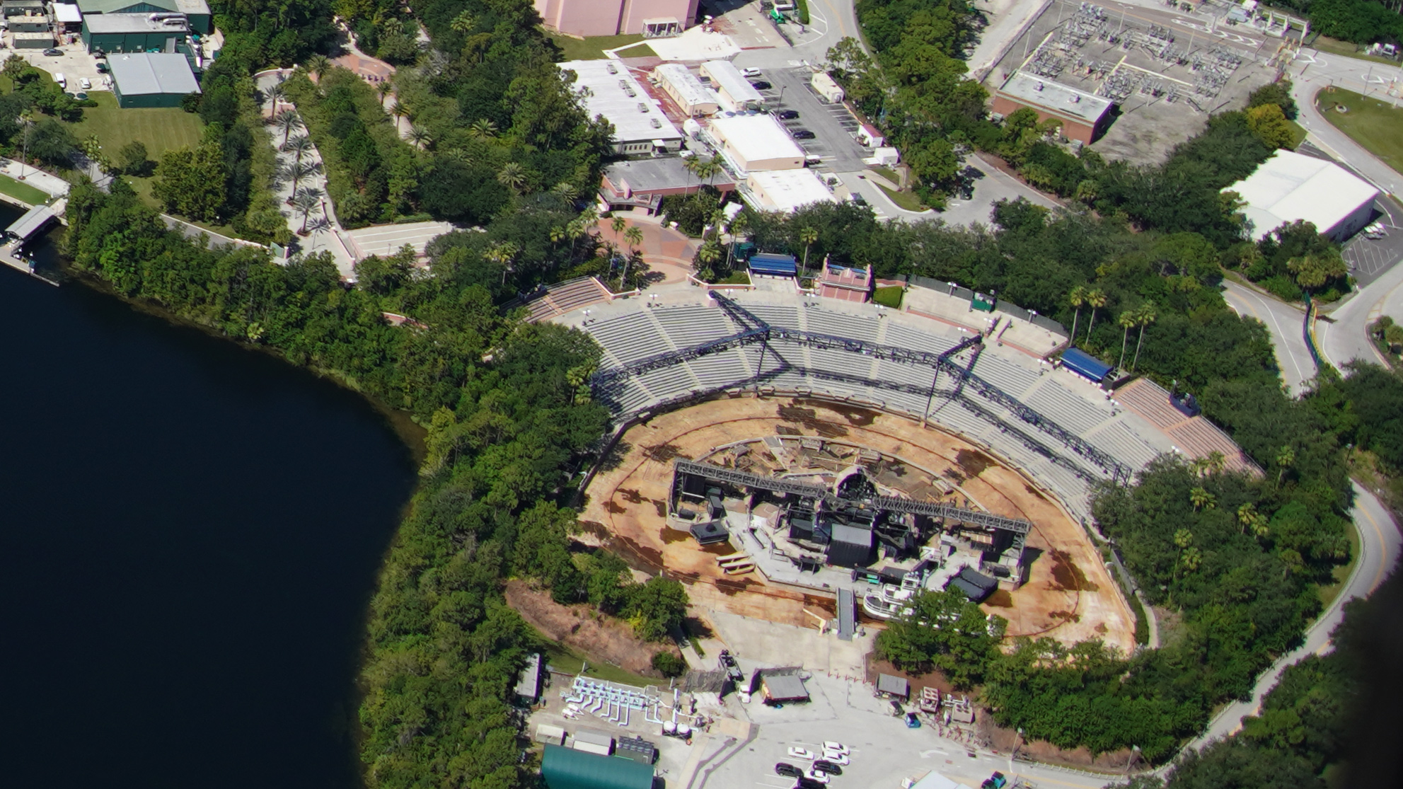 As seen in the photo above, the lagoon which is typically filled to assist with a variety of boats and water projection screens is currently drained.