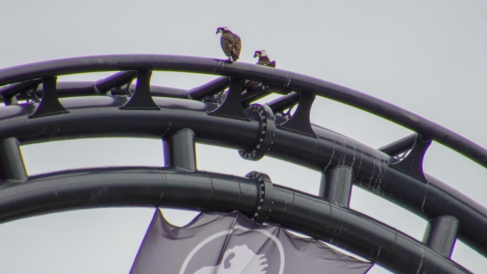 This past Friday, we reported on a female Osprey, which had been caught on camera making a nest in the same portion of the roller coaster, where the two birds were perched.
