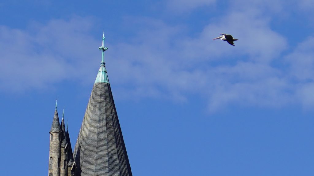 Staying on the subject of birds and The Wizarding World of Harry Potter, a pelican was caught on camera in flight near the tallest spire of Hogwarts Castle at Islands of Adventure: