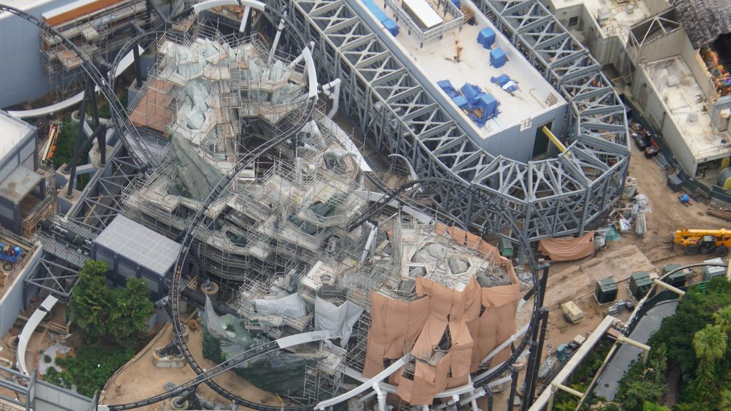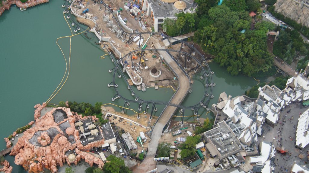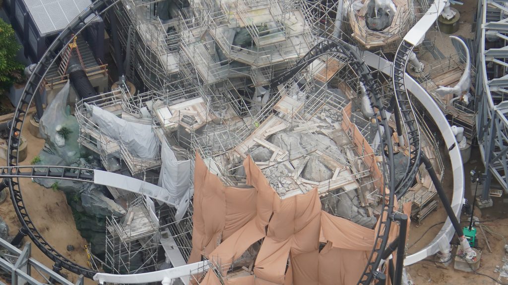 New aerial images of the still-unannounced Jurassic Park roller coaster, still under construction, can be found below: