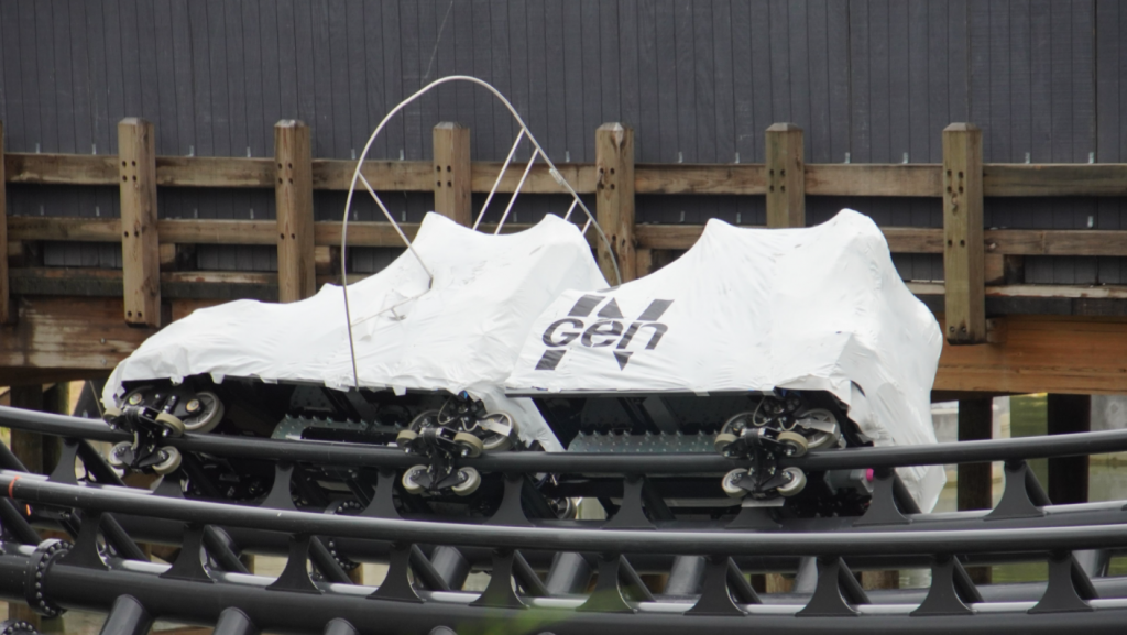 - Image #8: A close look at cars being slowly moved through the unannounced JPRC. Passage and clearance test. The large frame represents maximum rider arm reach. Note the fabric ropes on the track; these plus a boom crane are controlling the movement.