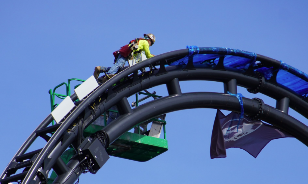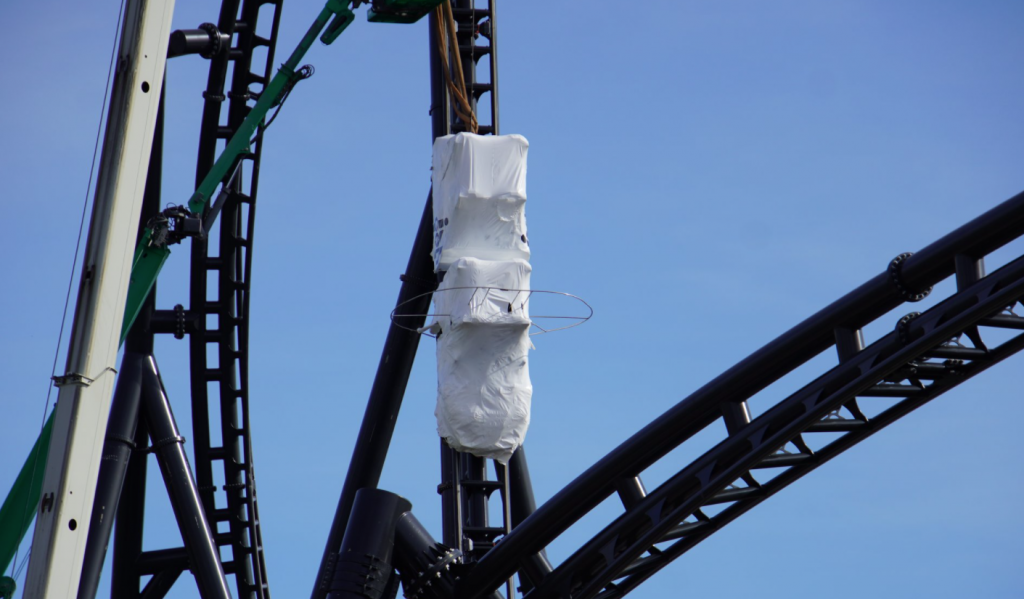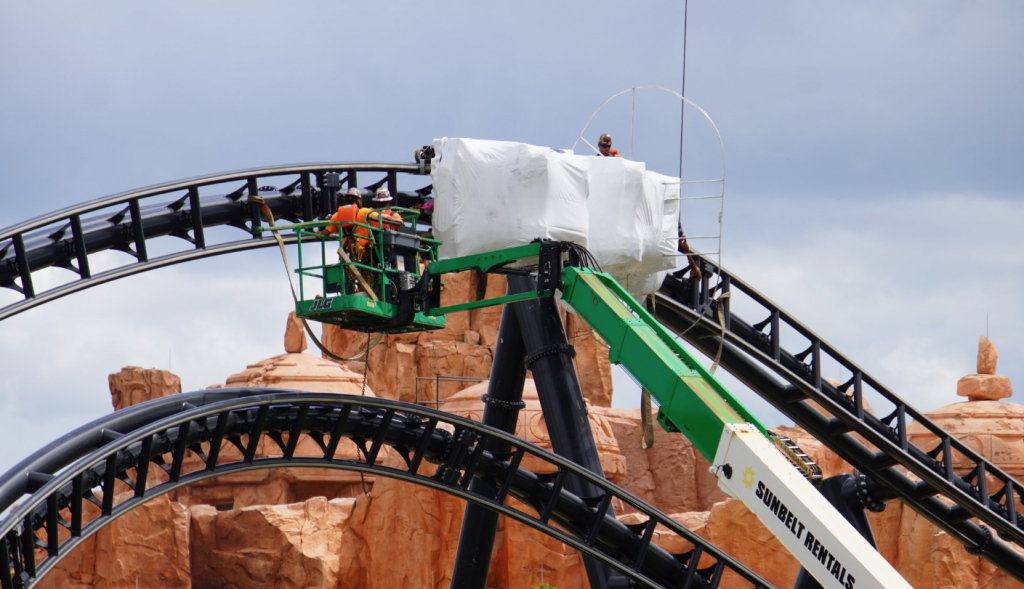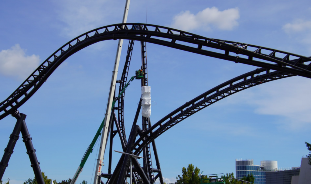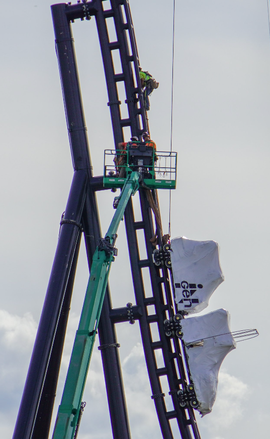 - Image #5: Roller coaster track frames cars being raised up the tallest track element of the unannounced JPRC.