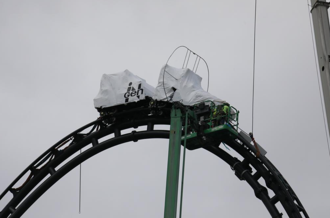 The ride vehicle for the still-unannounced and still-under-construction Jurassic Park roller coaster at Universal’s Islands of Adventure has reached the very top of the roller coaster’s top hat element during its pull-through testing.