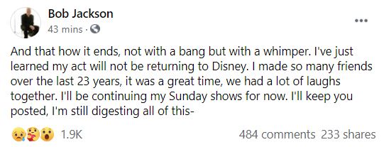 “And [that’s] how it ends, not with a bang but with a whimper. I’ve just learned my act will not be returning to Disney. I made so many friends over the last 23 years, it was a great time, we’ve had a lot of laughs together. I’ll be continuing my Sunday shows for now. I’ll keep you posted. I’m still digesting all of this.”