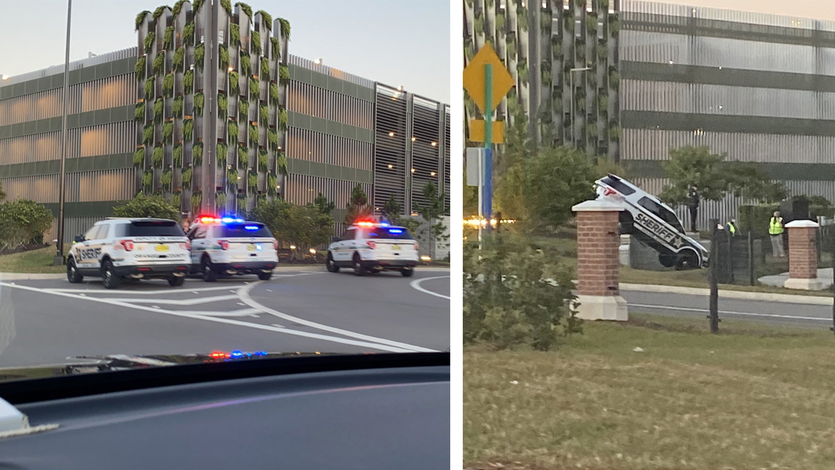 This weekend, an Orange County Sheriff’s Office vehicle ran off the road and landed in an almost-vertical position next to a Disney Springs parking garage.