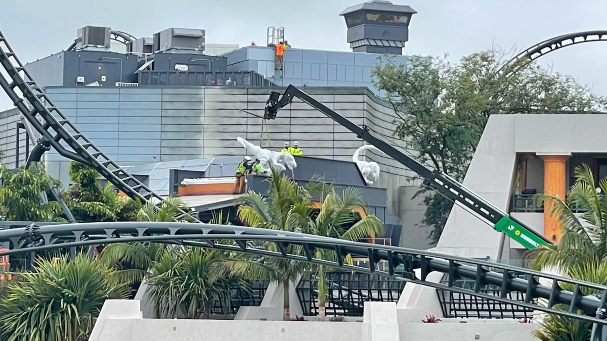 Raptor figures have been installed above the attraction’s entrance. Photos and a video of the raptor figures being added can be found below: