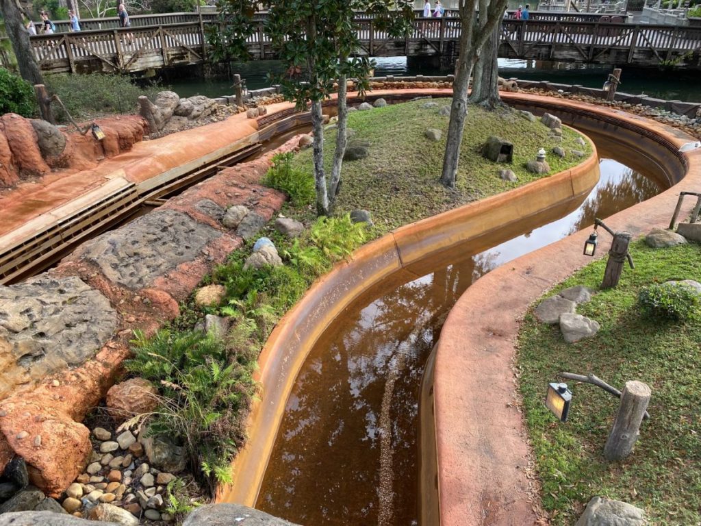 The photos below show where Splash Mountain’s water level sits based on the fading and erosion of the set pieces of the attraction: