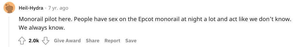 “Monorail pilot here. People have sex on the Epcot monorail at night a lot and act like we don’t know. We always know.”