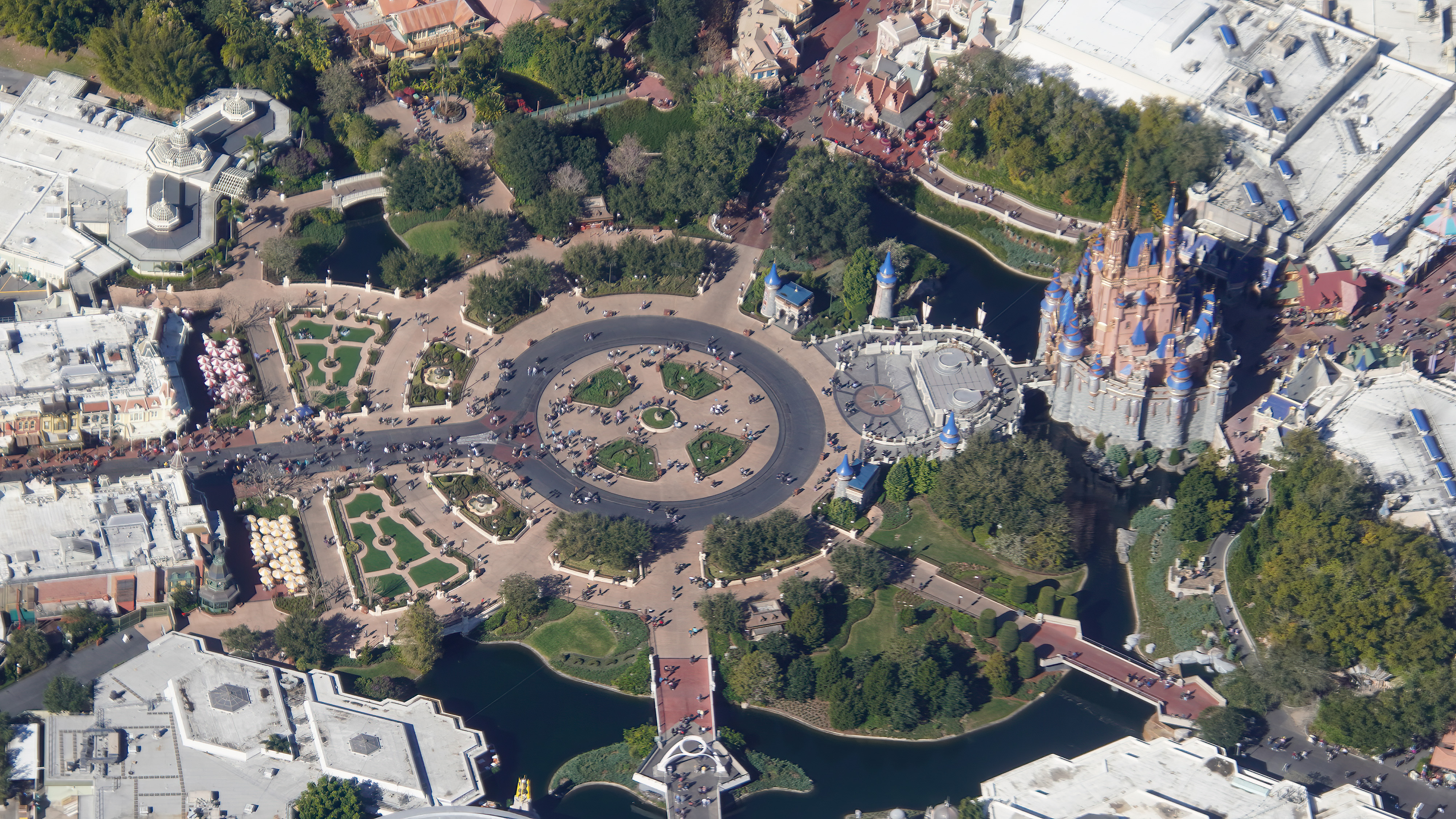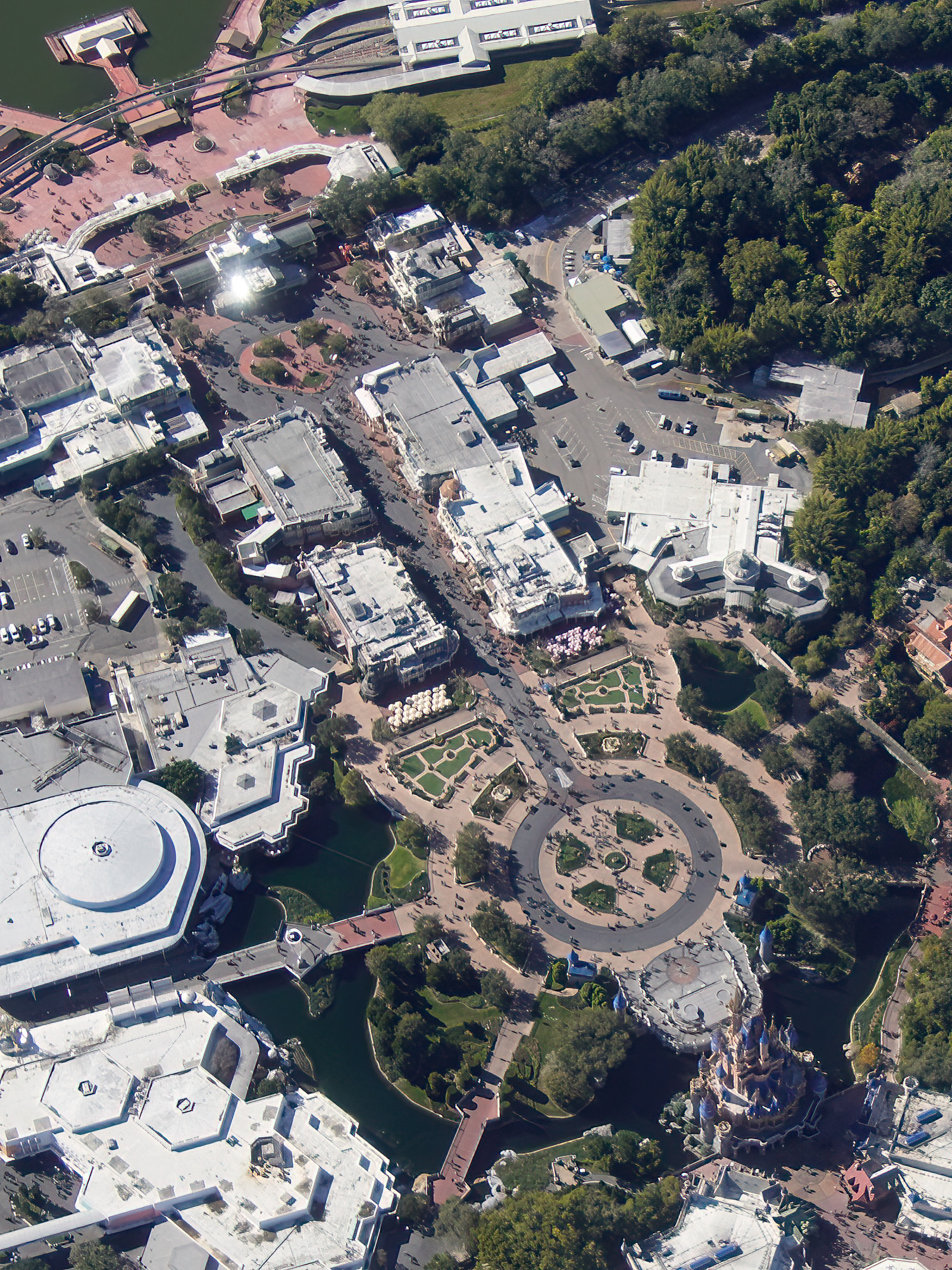 - Image #1: Aerial overview of Magic Kingdom. Bottom right shows recently go-away-green painted walls along a pond. Right side of Main Street is a tree-lined bypass. Top left is a common route of #runDisney courses, for leaving the park. Courses enter through the bus loop.