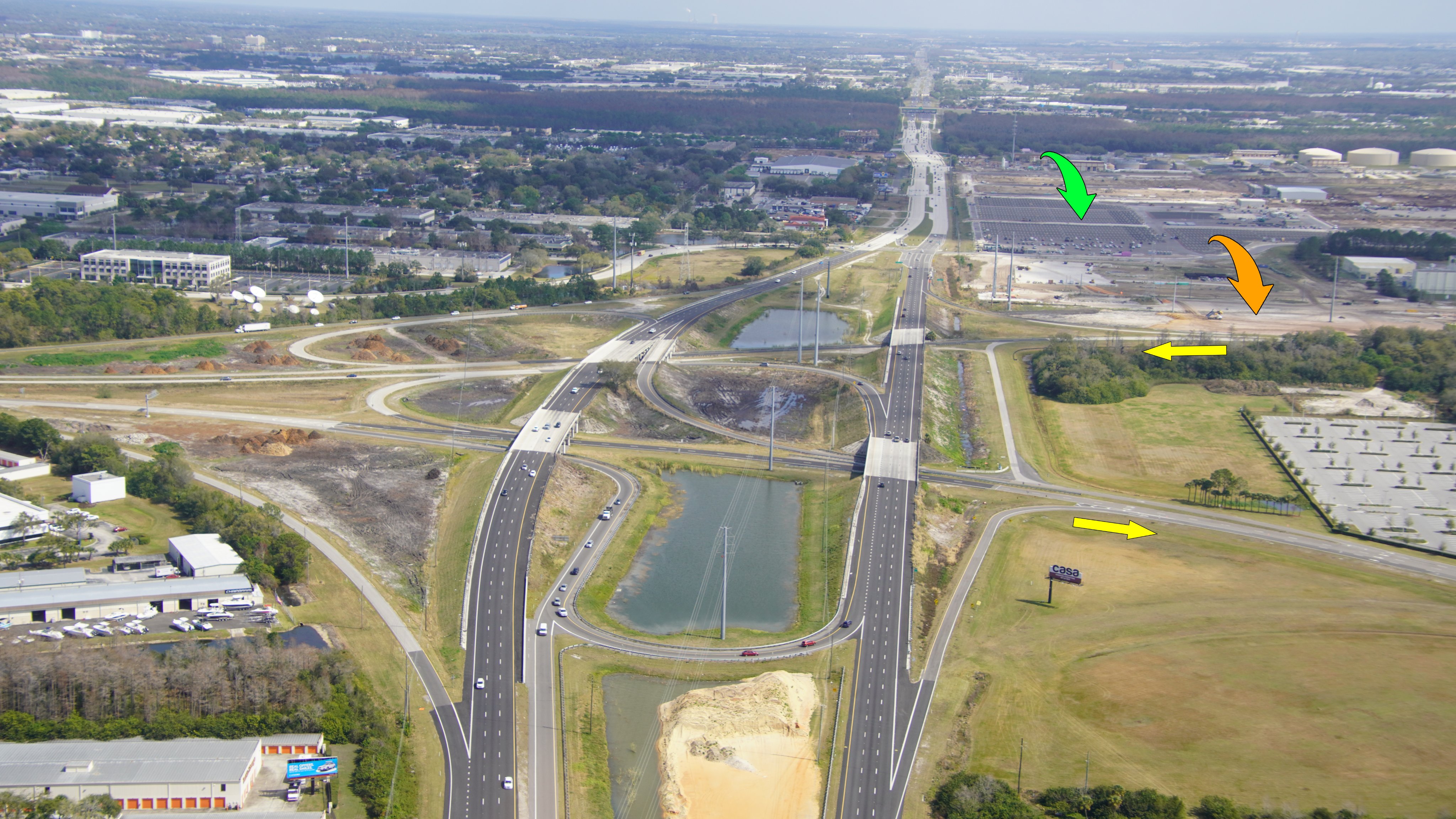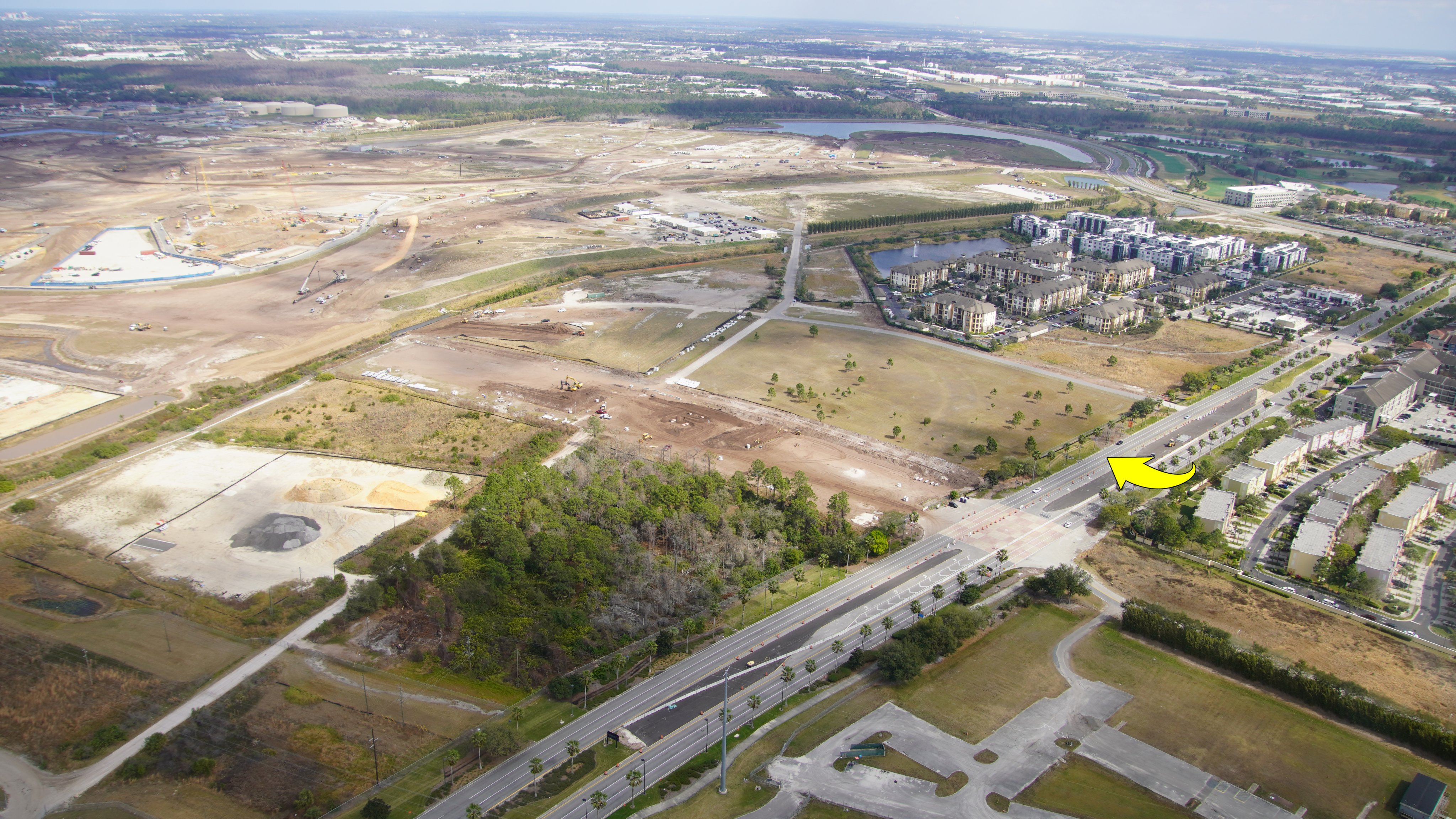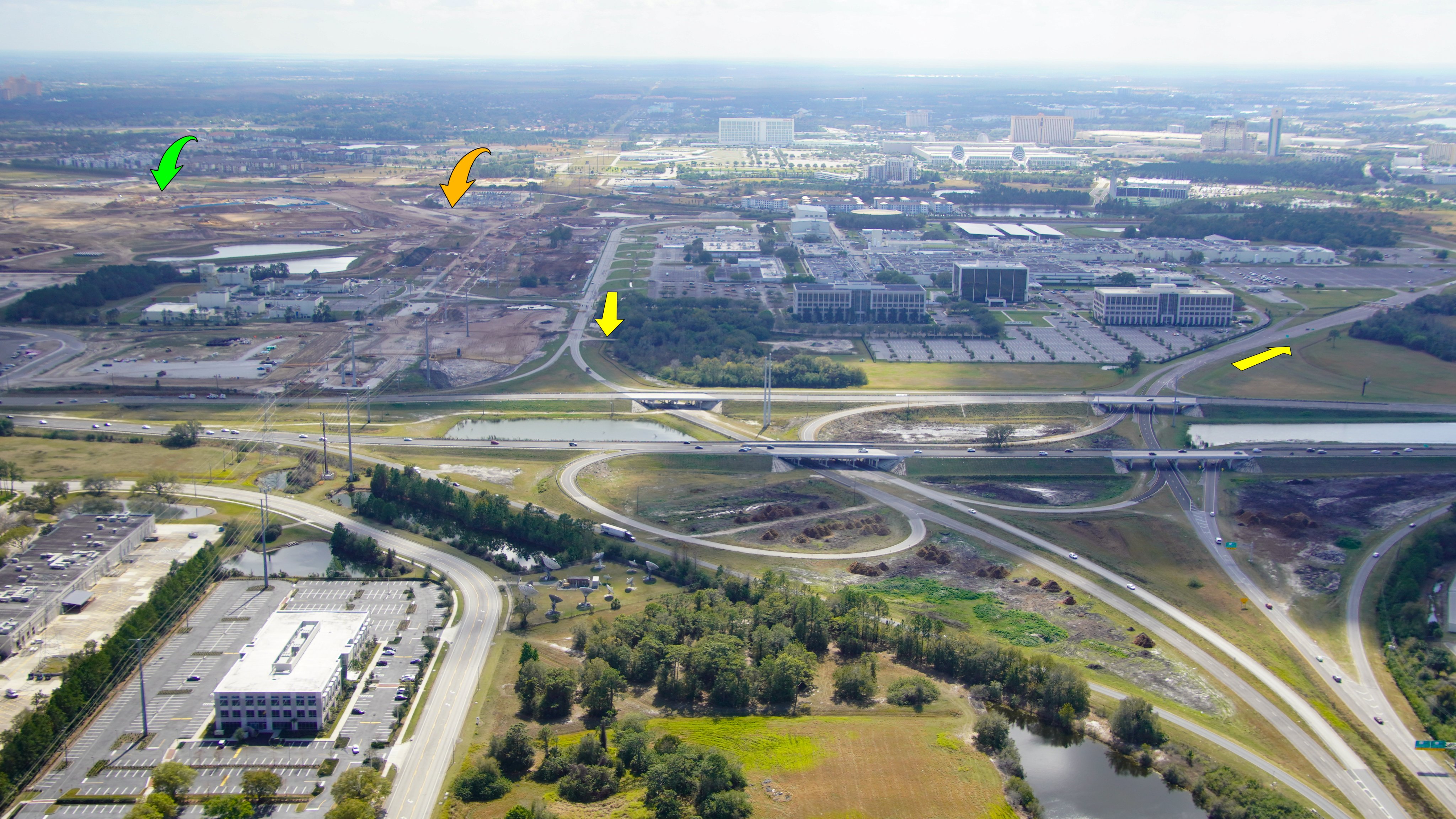 - Image #22: Aerial look at where Kirkman Rd currently ends at Sand Lake Rd. Yellow arrows are private roads (Lockheed). Orange arrow at where the Kirkman Rd extension is under construction. Not yet known how it ties with these existing roads. Green arrow at Epic Universe team parking.