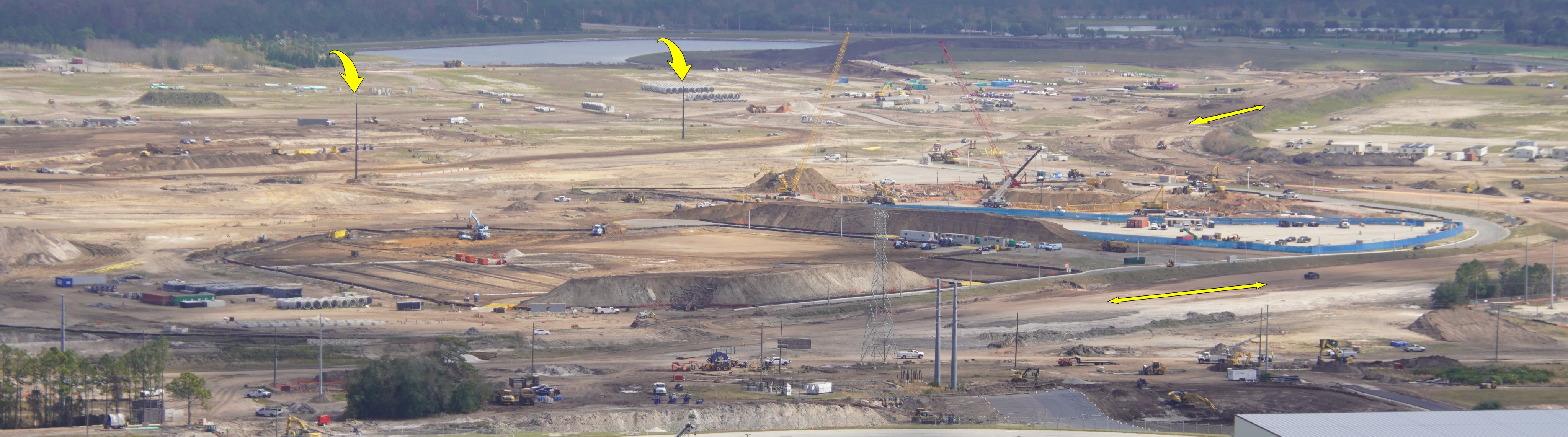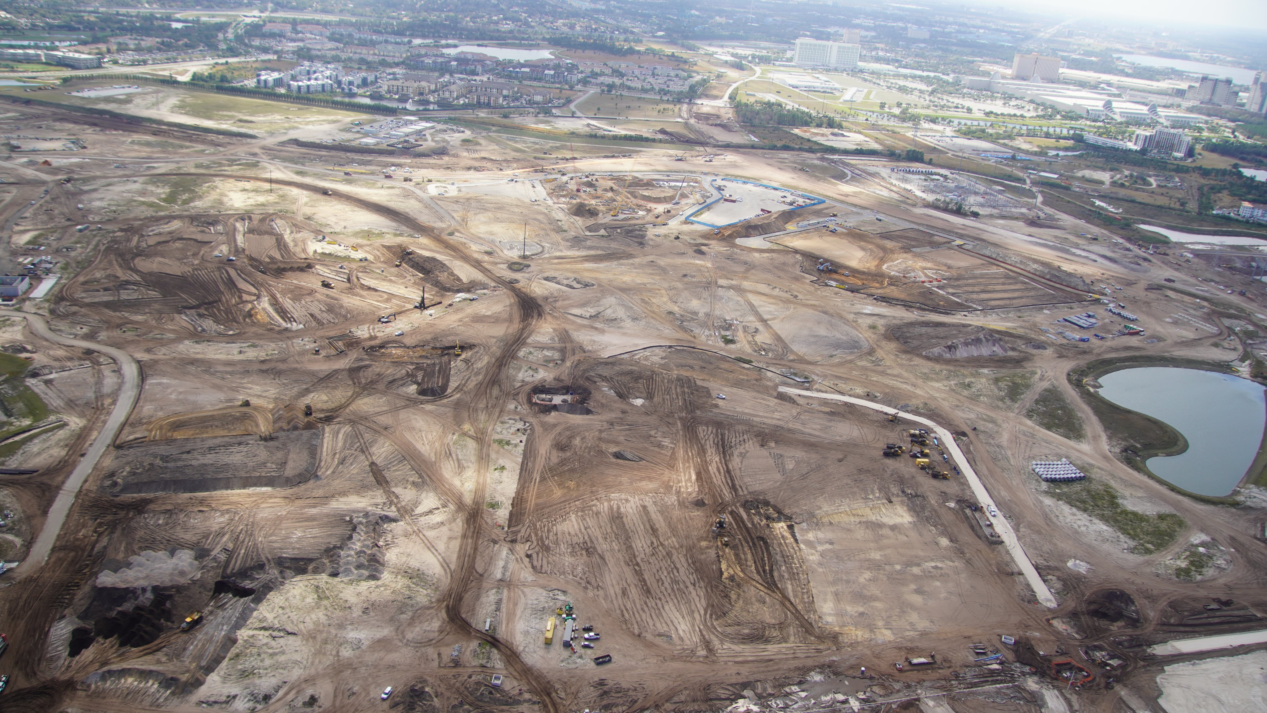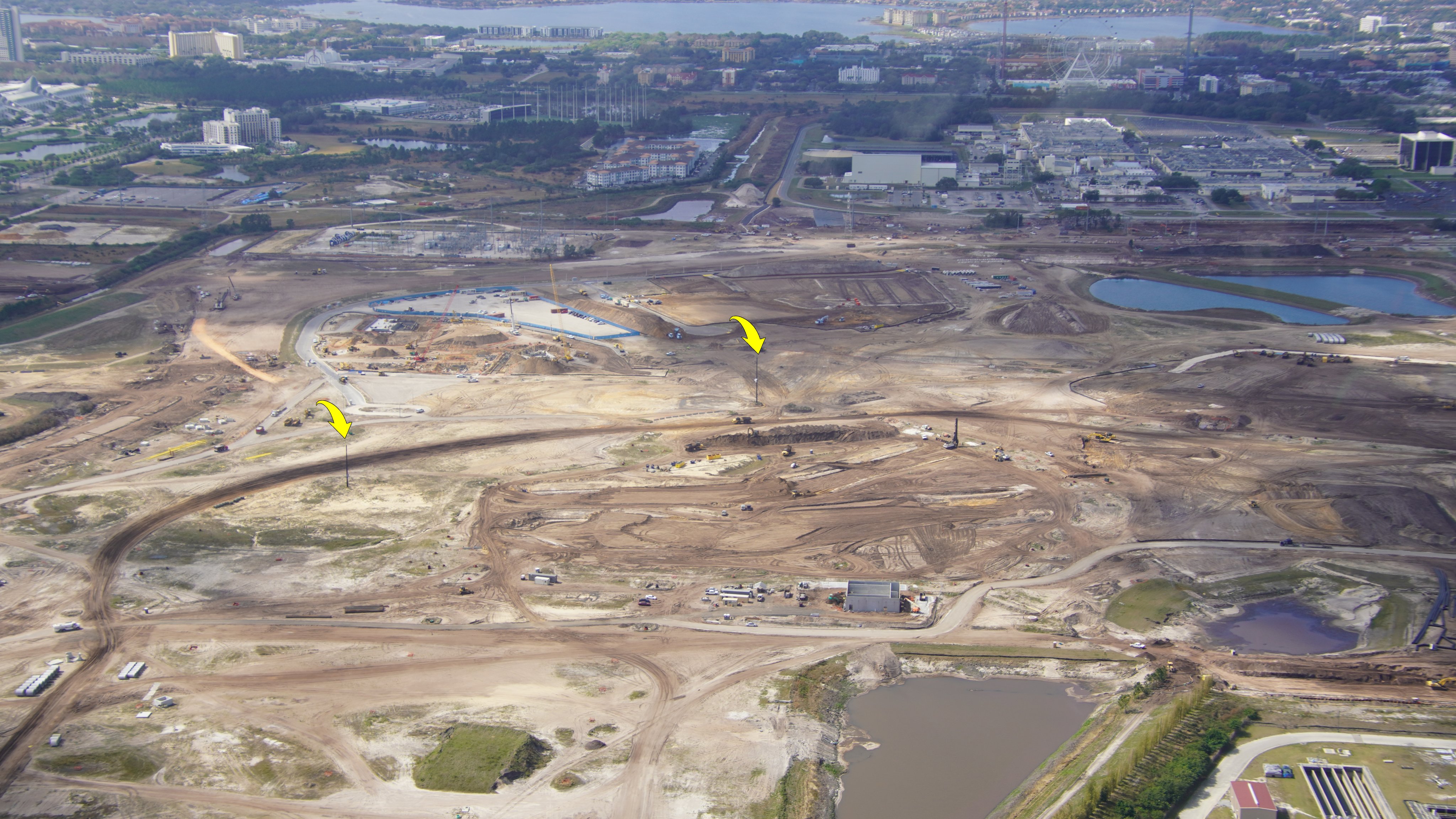 - Image #4: Aerial photo looking across site of Epic Universe. Left arrow about where the entrance will be. Other arrow about center of the theme park.