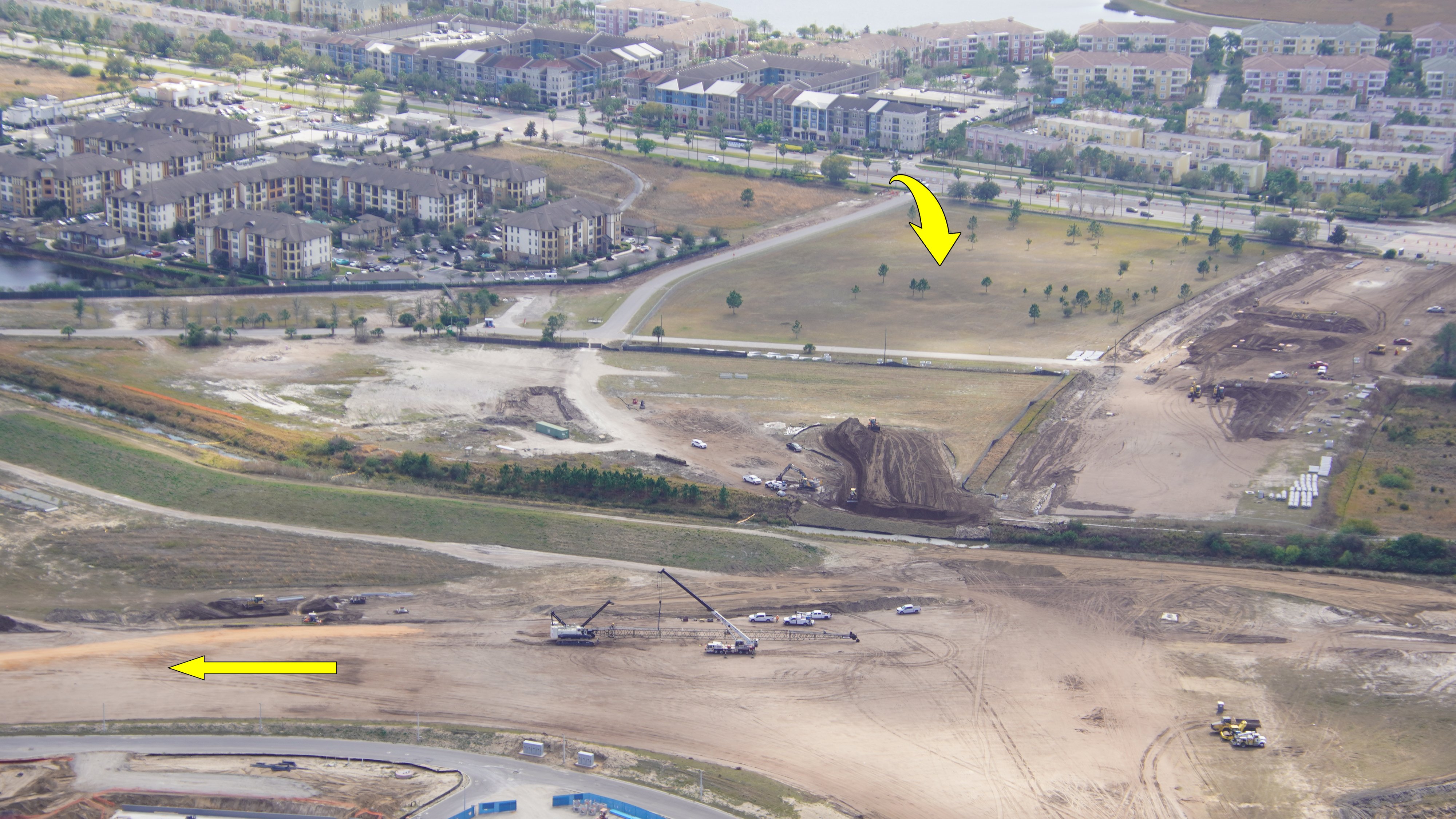 - Image #25: Aerial look at where (top arrow) an Epic Universe related hotel will be built. Universal Blvd at top of photo. Construction of Kirkman Rd extension at right. Left arrow on a road bed reaching day guest parking.