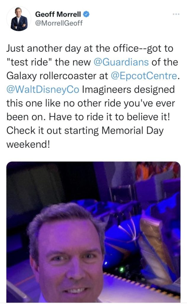 “Just another day at the office — got to “test ride” the new @Guardians of the Galaxy rollercoaster at @EpcotCentre. @WaltDisney Imagineers designed this one like no other ride you’ve ever been on. Have to die it to believe it! Check it out starting Memorial Day weekend.”