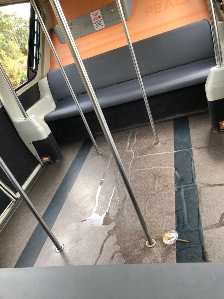 As the photo below shows, a wet mess was left by a guest on a Monorail for Walt Disney World Cast Members to clean up.