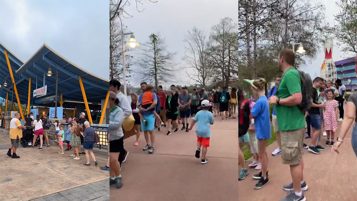 As the video below shows, guests staying at both Disney’s Pop Century Resort and Disney’s Art of Animation waited in a lengthy line for the Disney Skyliner.