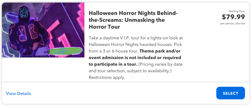 Halloween Horror Nights Behind-the-Screams: Unmasking the House Tour is a daytime VIP tour where you get to look at the haunted houses with the lights on. You can choose from either a three or six-haunted house tour and pricing starts at $79.99 per person, plus tax. Daytime admission to Universal Studios Florida is required, and sold separately.