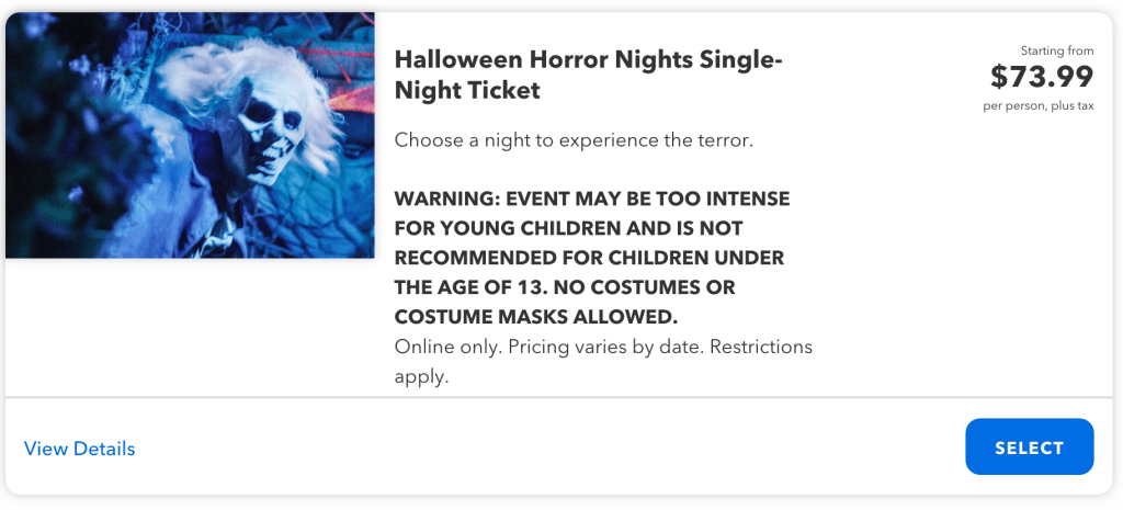 Halloween Horror Nights Single-Night Tickets start $73.99 per person (plus tax), and can go up to $104.99 depending on the selected date. It’s vital to know that this pricing for for only ticket purchases only. You can find out more details and purchase your tickets here.