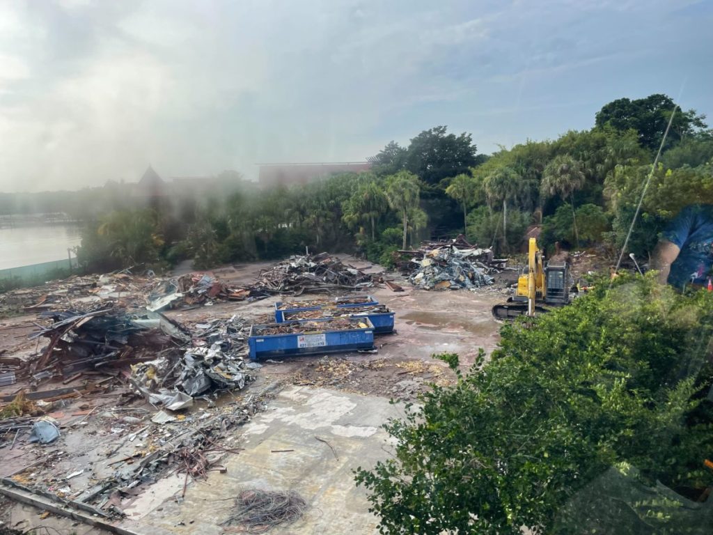 Guests can see the demolition site clearly when riding the Monorail. The photo below shows several blue dumpsters full of demolition debris (an excavator can be seen in the right-hand corner).