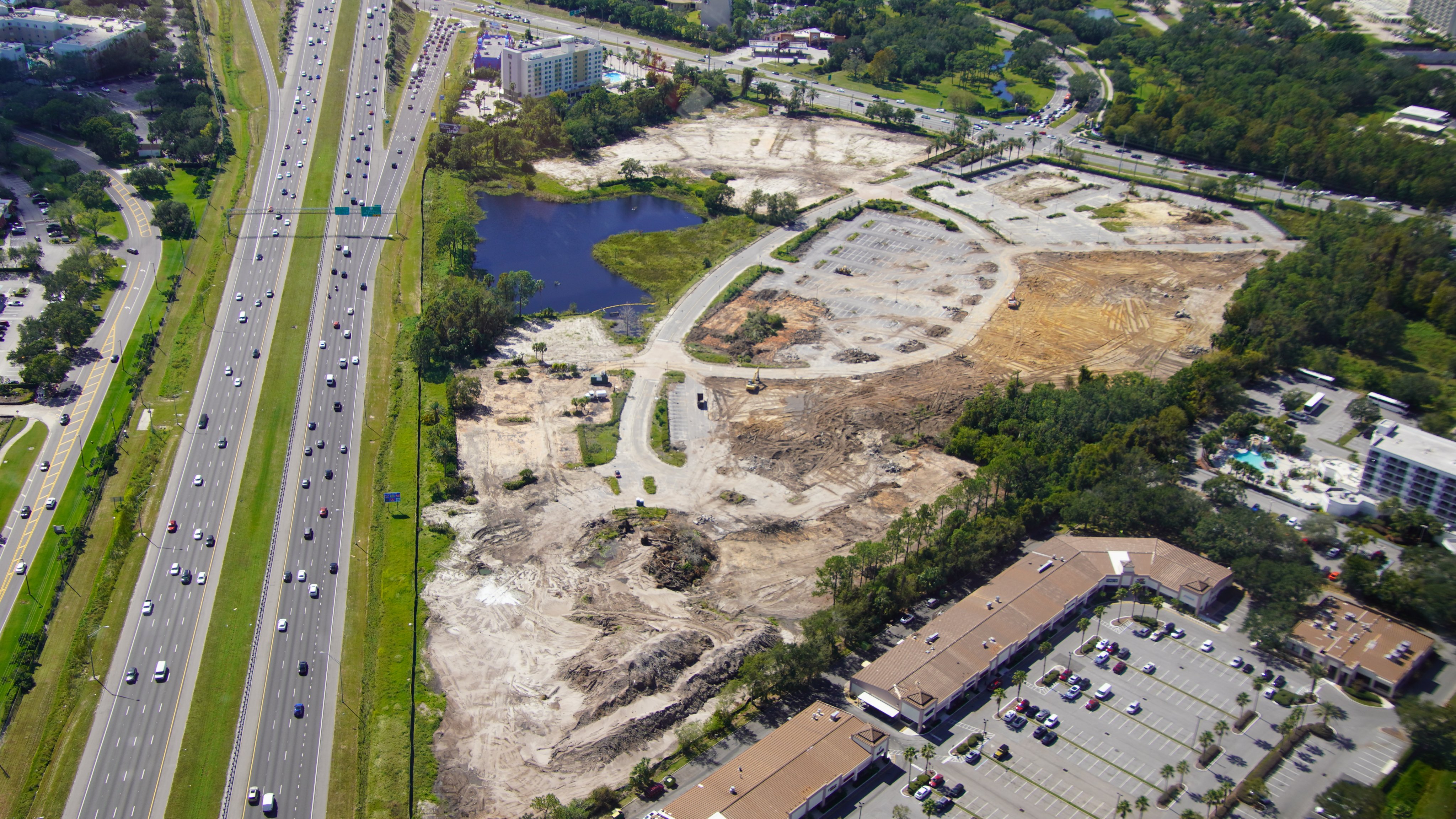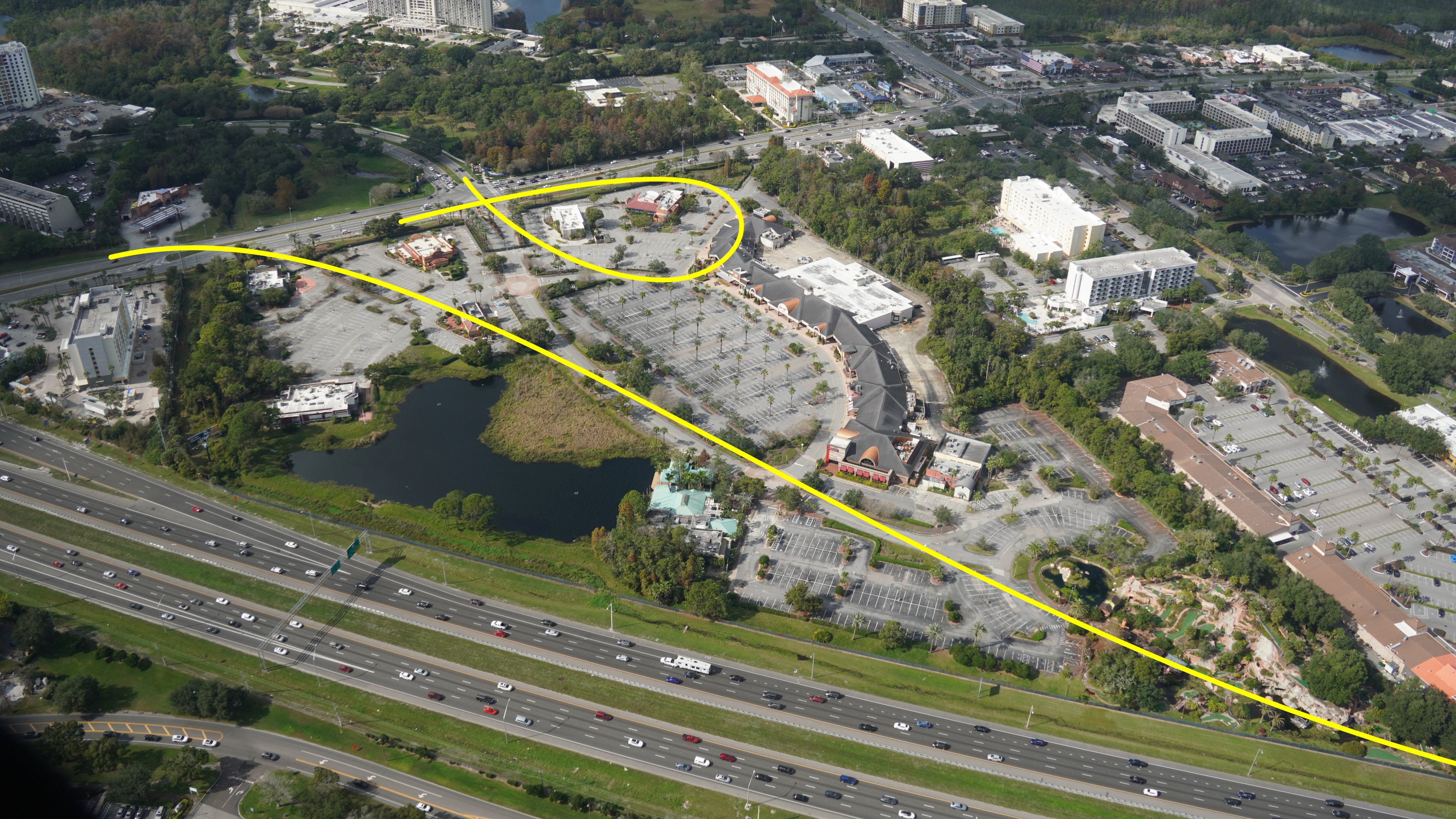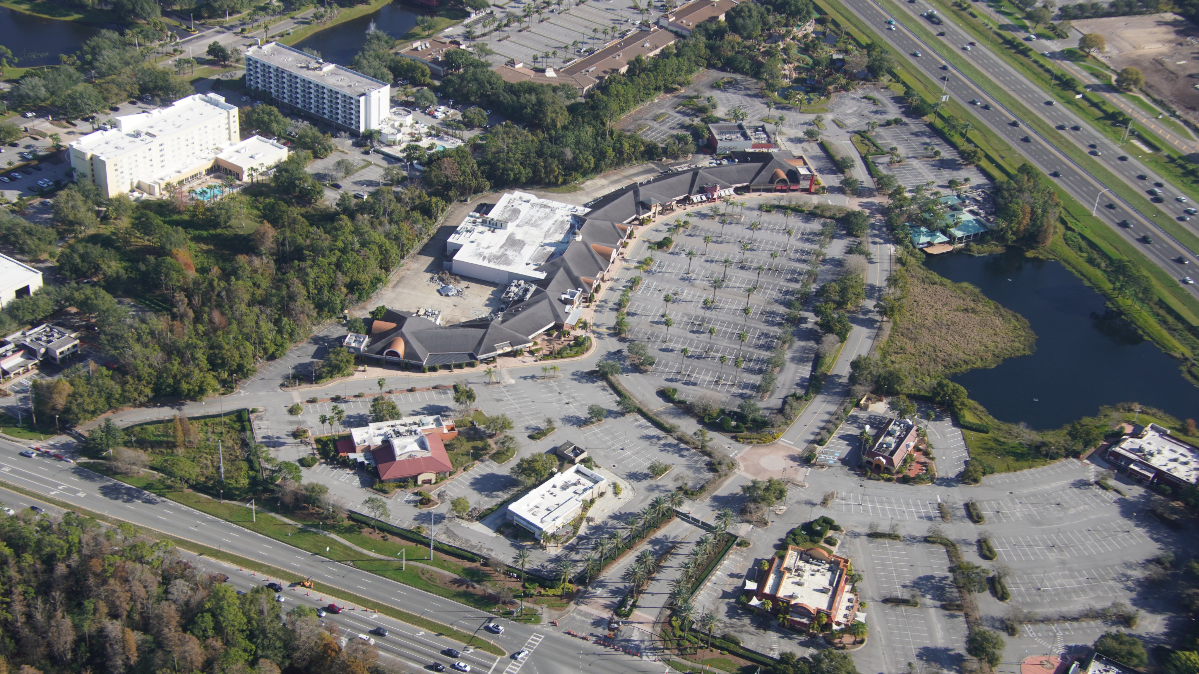 - Image #6: Oct 1 aerial overview of former CrossRoads plaza. Developed by Disney and sold. Then bought years later by FLDOT. Recently closed for demolition to add I-4 traffic improvements at SR 535.