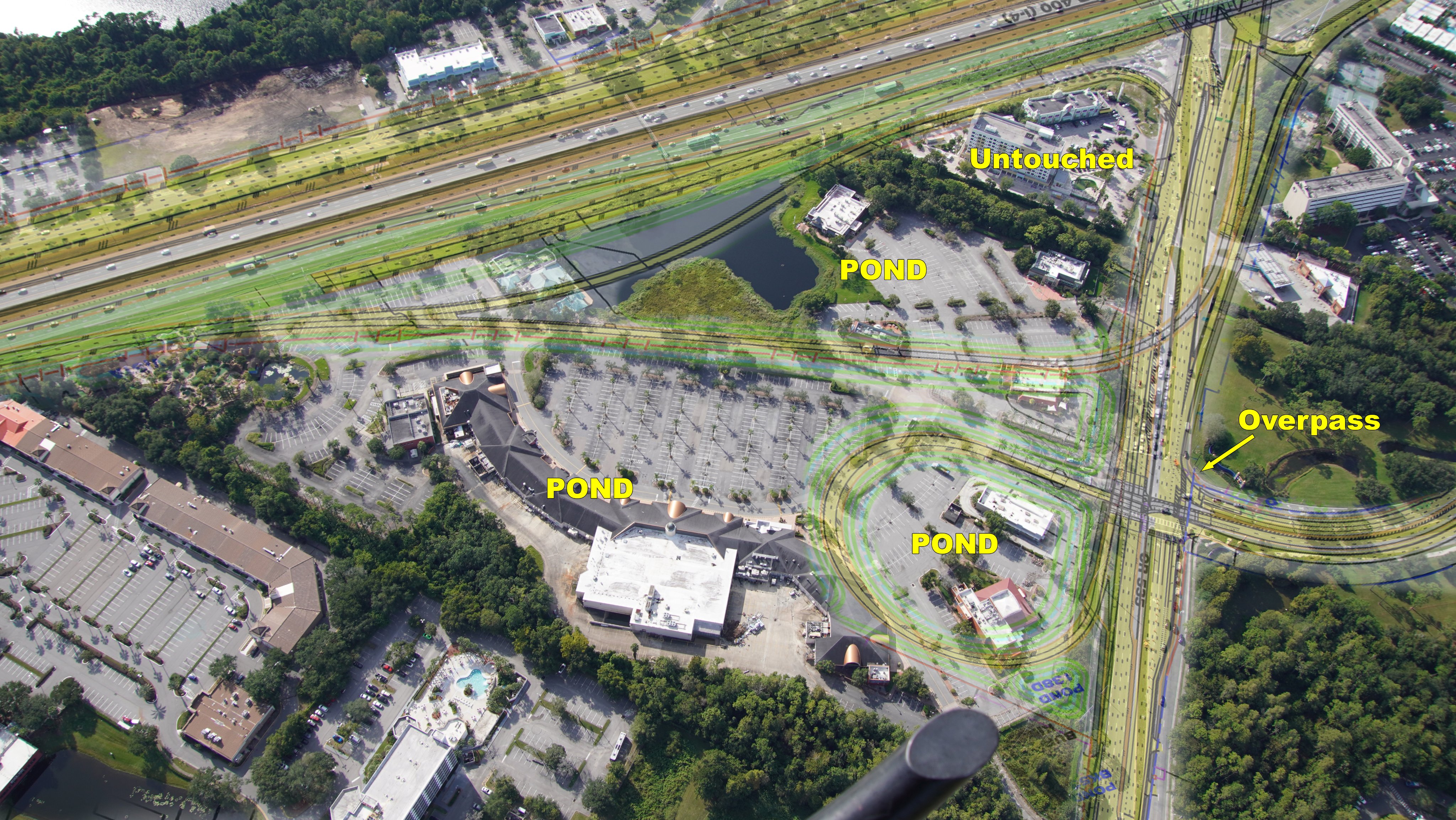 - Image #4 & #5: Approximate overlay of the I-4 traffic improvements planned at site of CrossRoads. Sand excavated for ponds to be used for I-4 roadbeds. Ponds also provide places for rain to drain from I-4. Attached also is FLDOT* planning map.