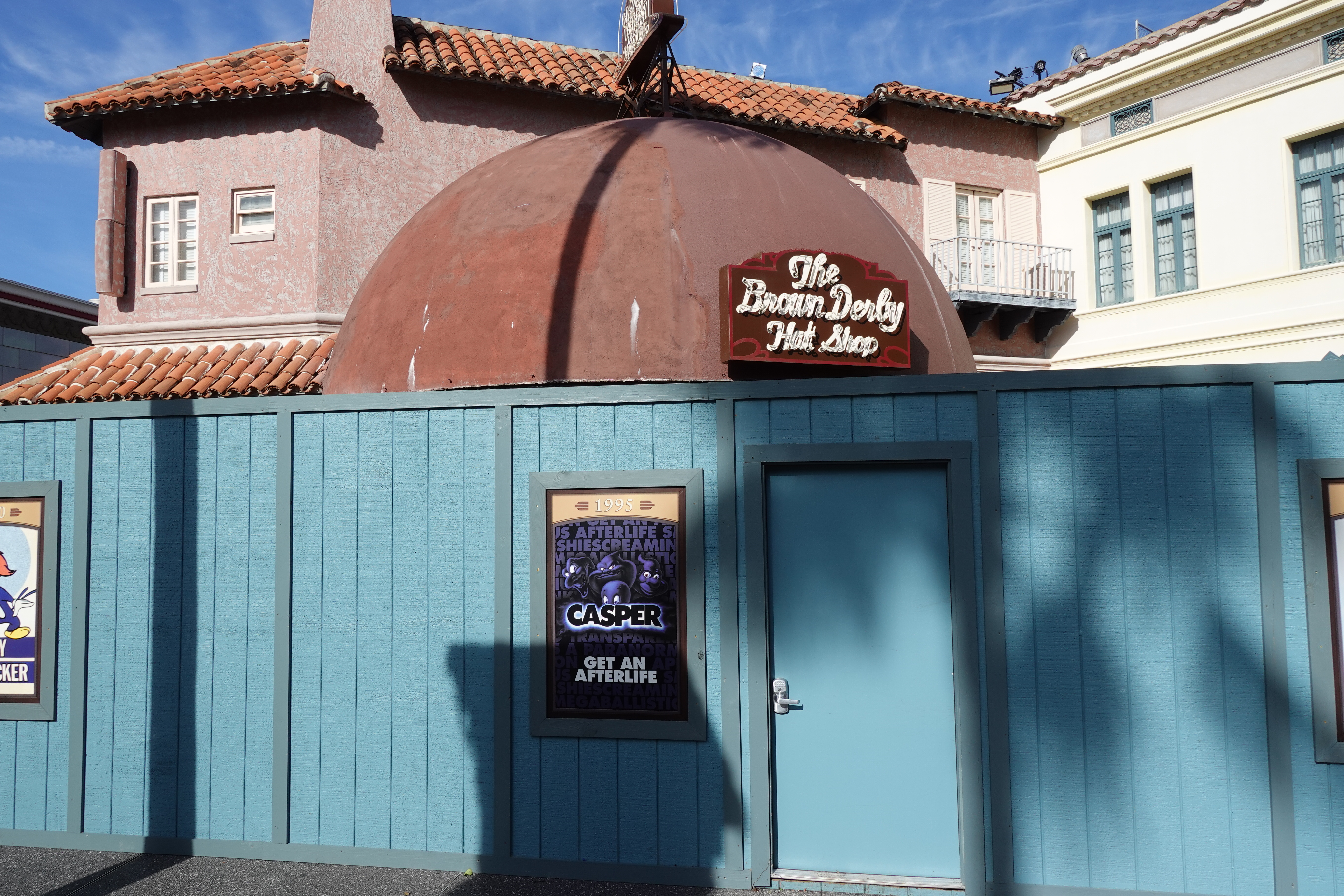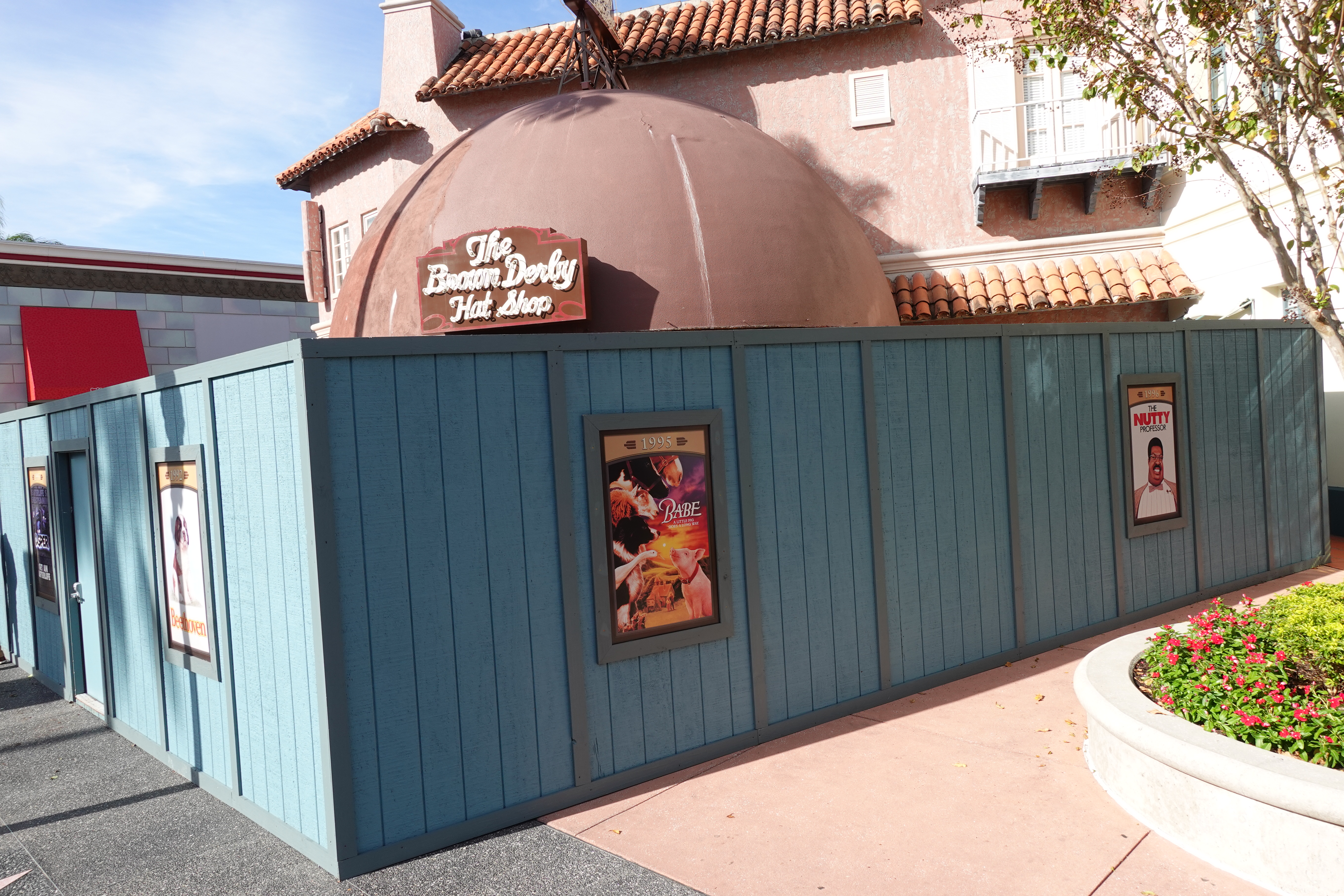 The refurbishment of The Brown Derby Hat Shop continues. Construction walls surround the shop, which is located in the Hollywood section of Universal Studios Florida.