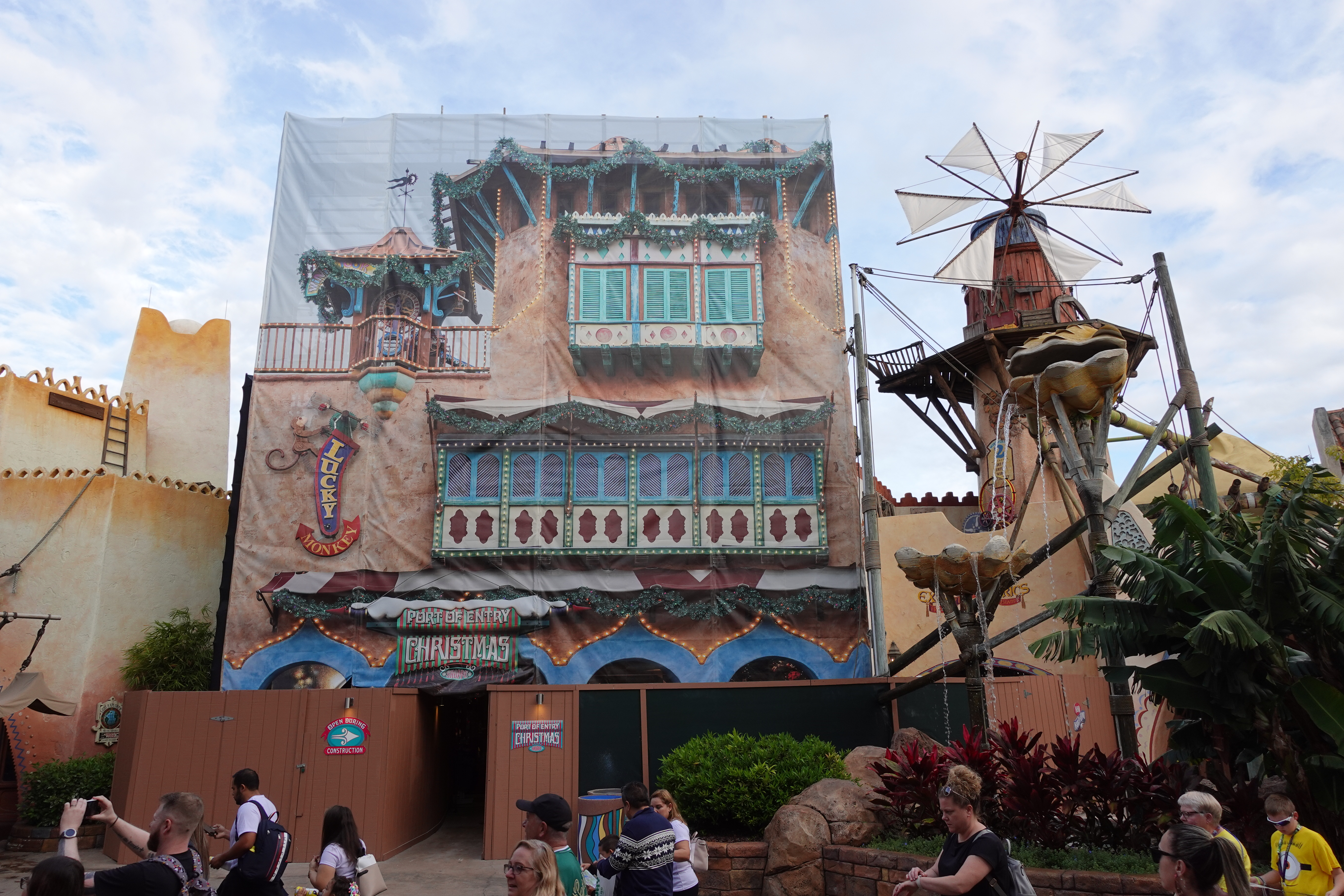 Construction walls surround (scrim included) the Christmas Store in the Port of Entry section of Islands of Adventure.