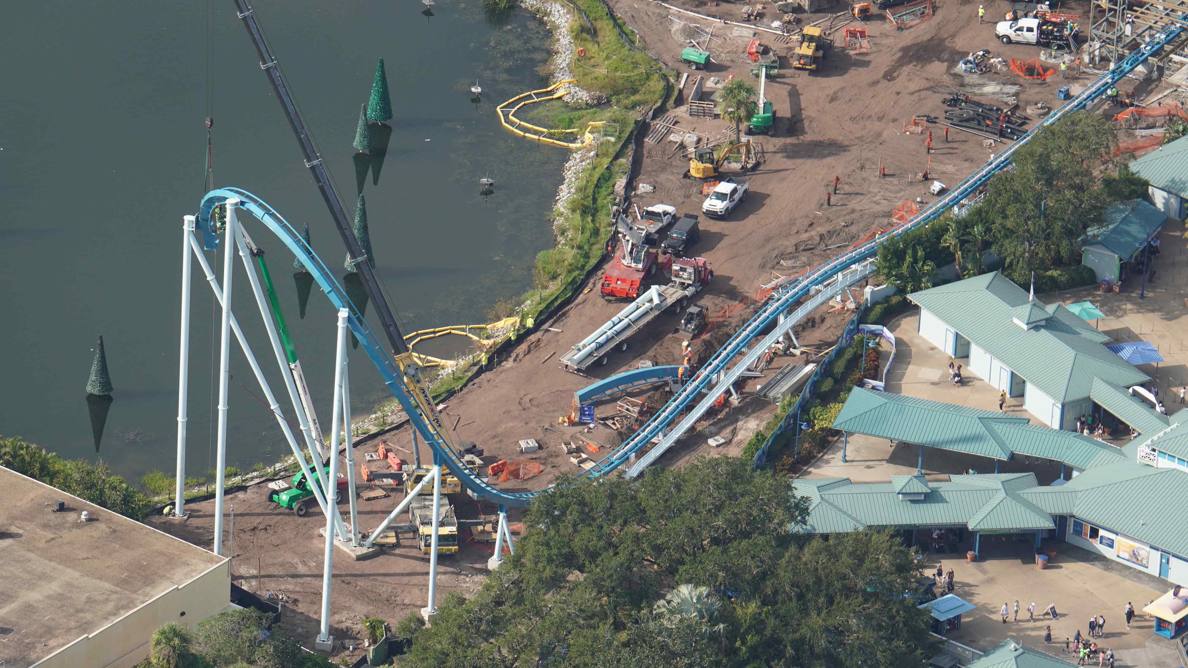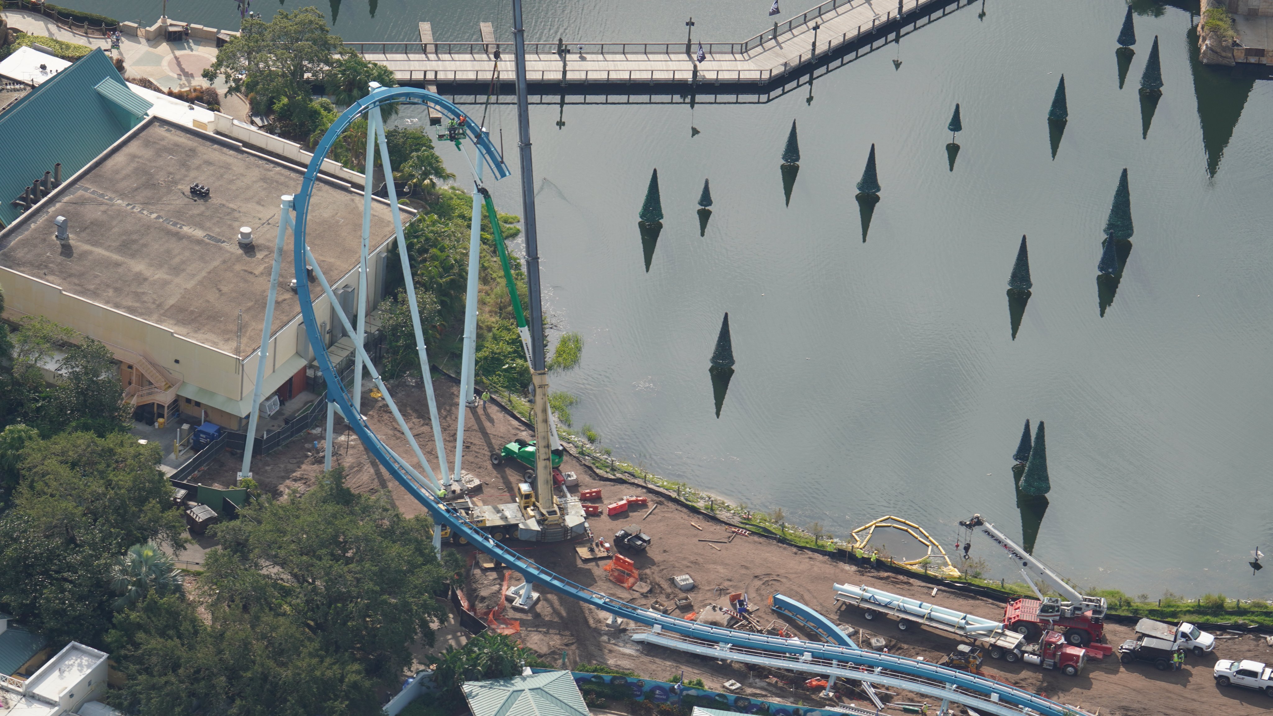 - Image #1: Aerial look at workers placing track of the new Pipeline Surf Coaster at SeaWorld Orlando.