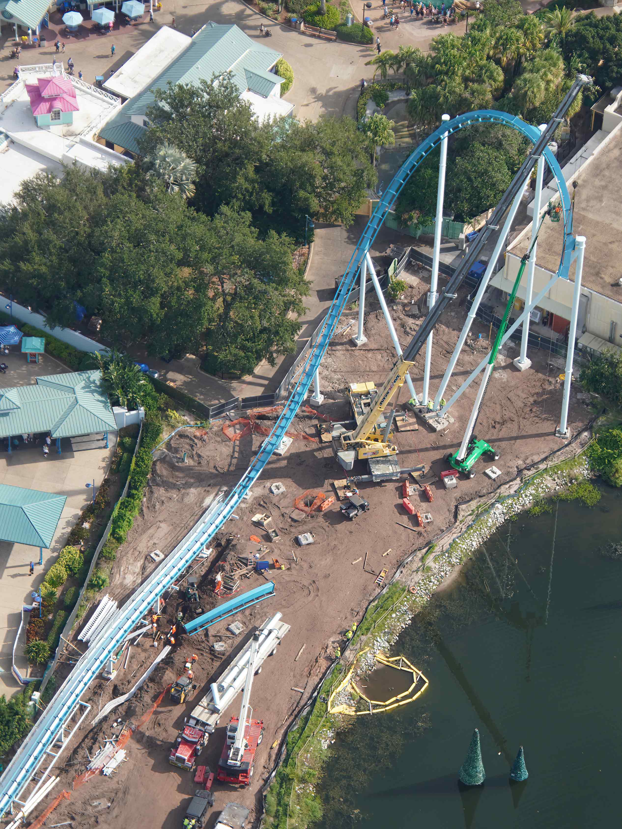 - Image #4: Aerial look at Pipeline Surf Coaster construction in SeaWorld Orlando. Workers are actively connecting just raised track at top right. Next supports and track to be placed are staged at bottom left.