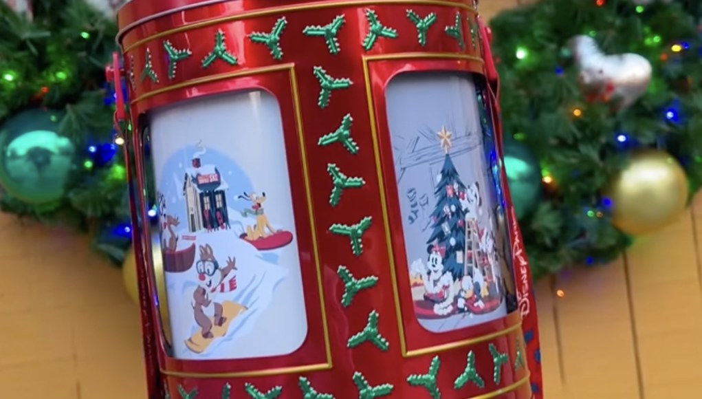 The tin is red with green holly and a gold trim. According to WDWNT, it winds up on the bottom to play music box versions of holiday songs.