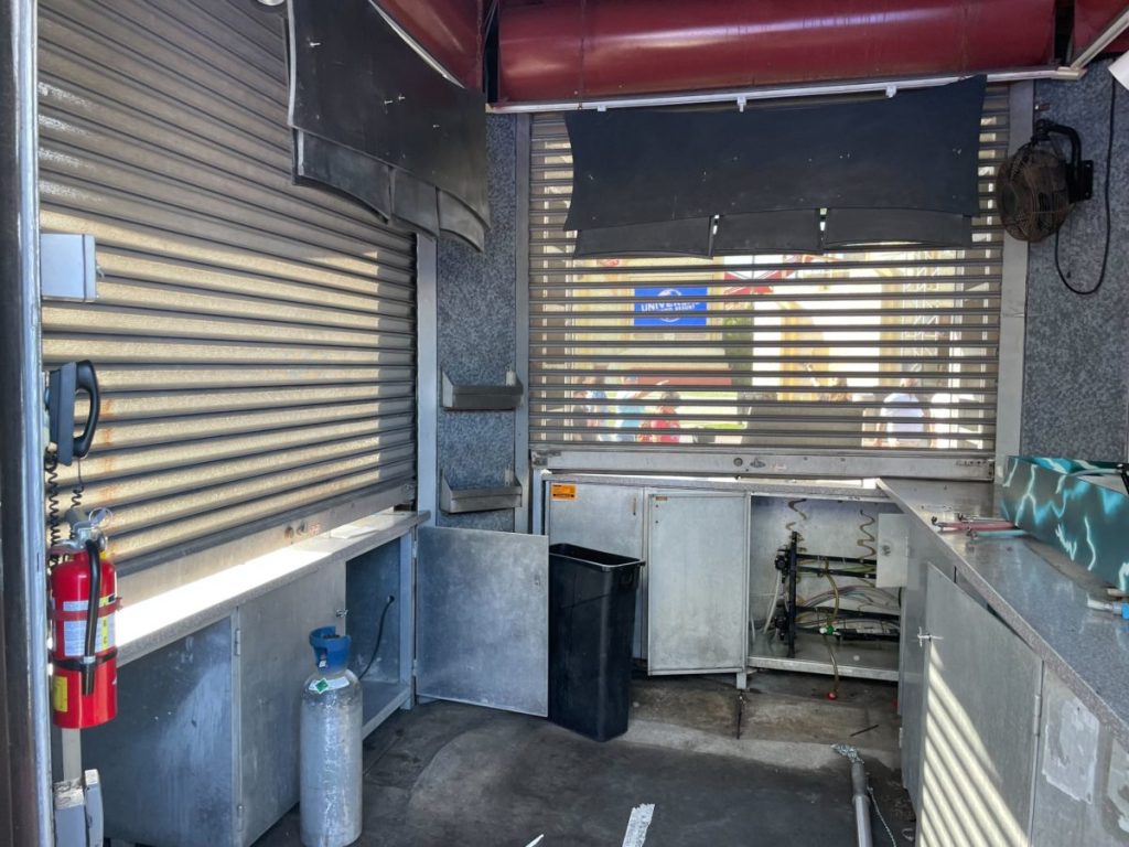 The café closed back in May, but Bone Chillin’ remained open outside the construction walls. Frankenstein, The Wolfman, and the Creature From The Black Lagoon span on top of the drink stand.