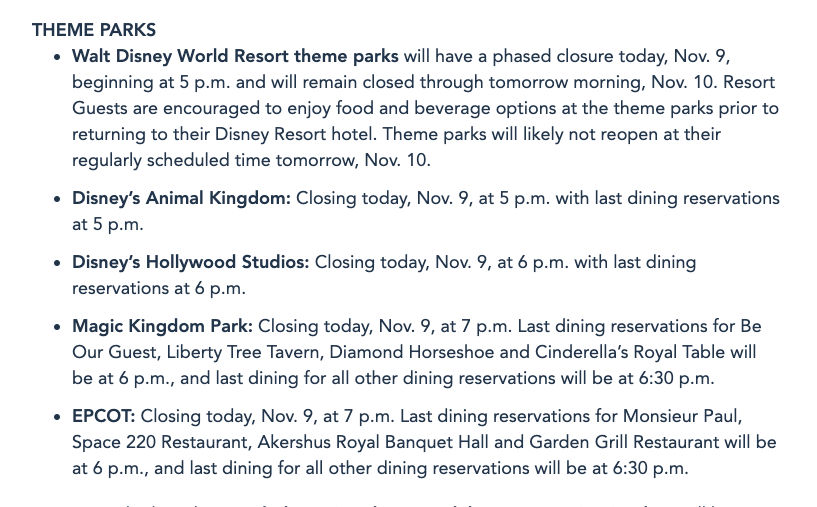 Walt Disney World Resort theme parks will have a phased closure today, Nov. 9th, beginning at 5 p.m. and will remain closed through tomorrow morning, Nov. 10. Resort Guests are encouraged to enjoy food and beverage options at the theme parks prior to returning to their Disney Resort hotel. Theme parks will likely not reopen at the regularly scheduled time tomorrow, Nov. 10.
