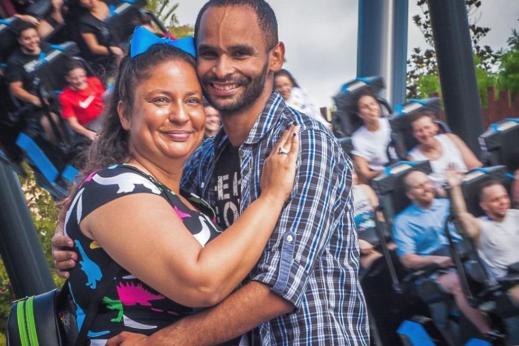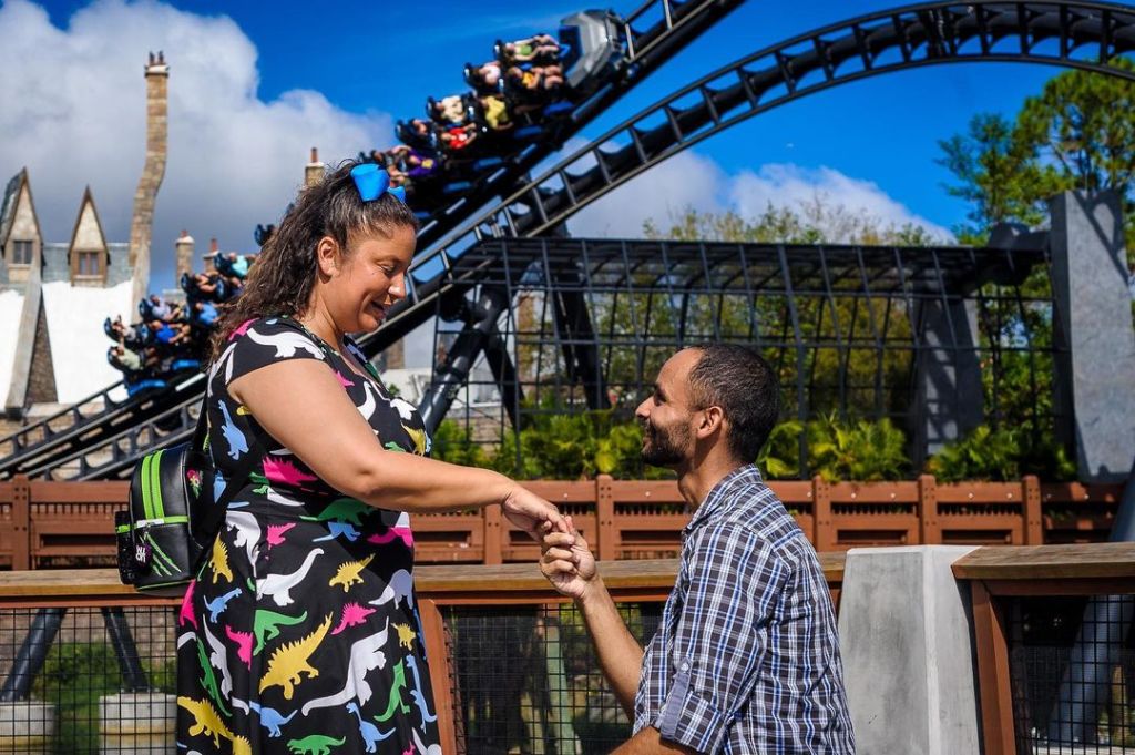 Picture perfect! The photos below show a man proposing to his girlfriend in front of Jurassic World VelociCoaster at Universal’s Islands of Adventure.