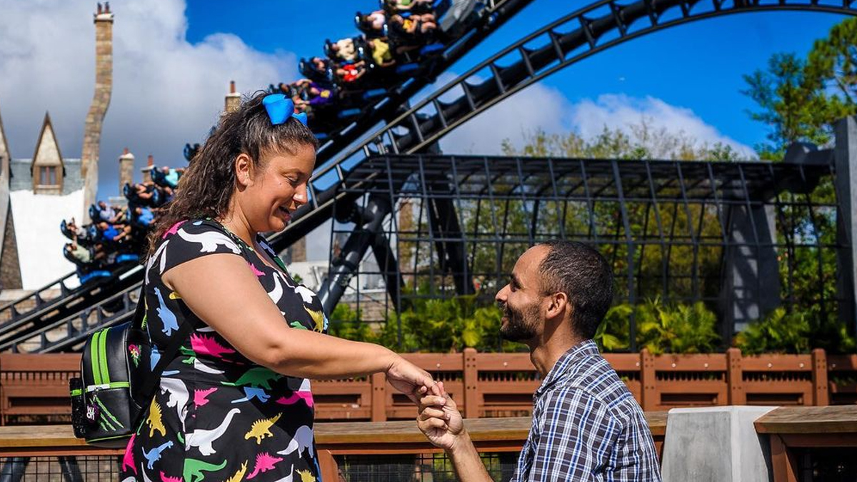 Picture perfect! The photos below show a man proposing to his girlfriend in front of Jurassic World VelociCoaster at Universal’s Islands of Adventure.