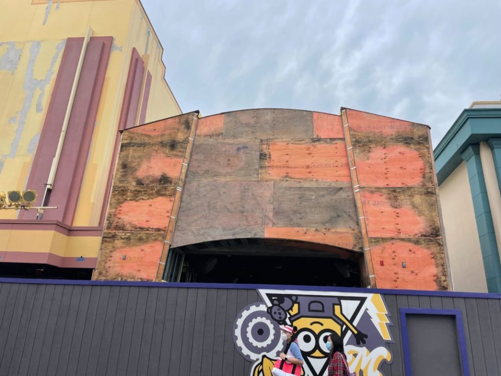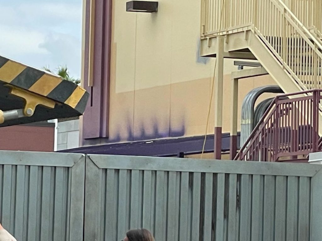 Several weeks ago, a WDWNT contributor saw crew members painting the back wall of the former Shrek 4-D show building. Now, there are grey streaks across it.