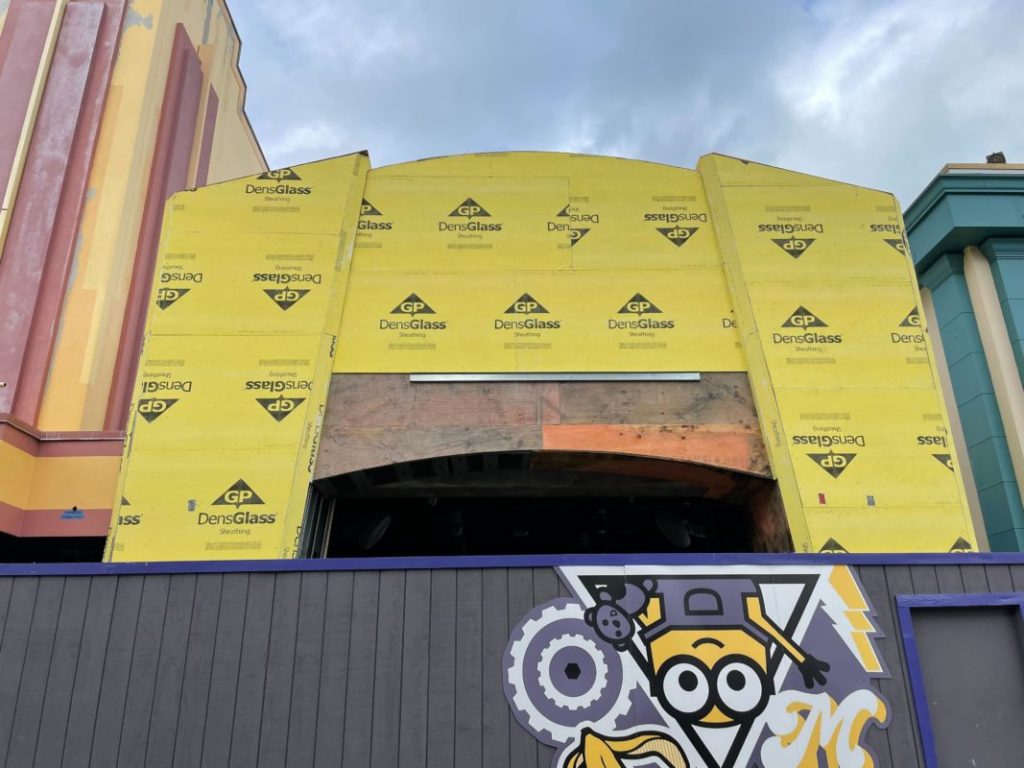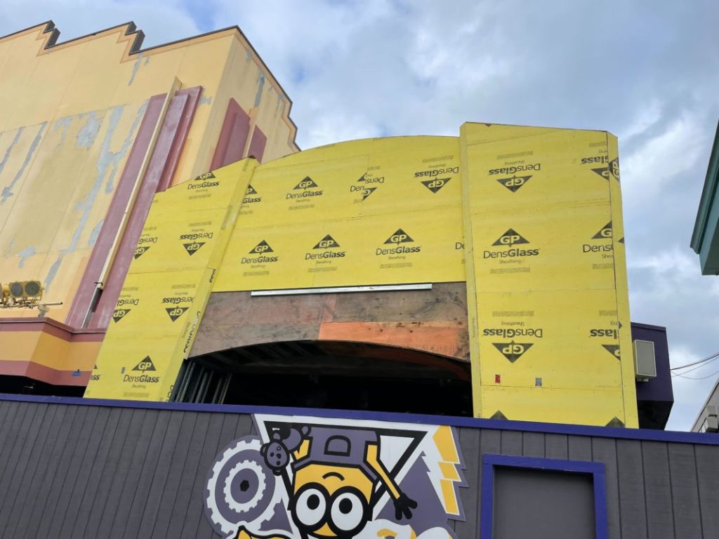 Construction work on the entrance of the Shrek 4-D building at Universal Studios Florida has ramped up. In our last update, exposed steel (added to the frame) formed an archway over the entrance.