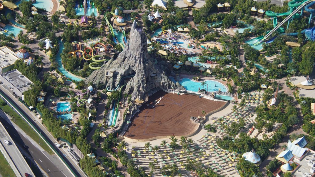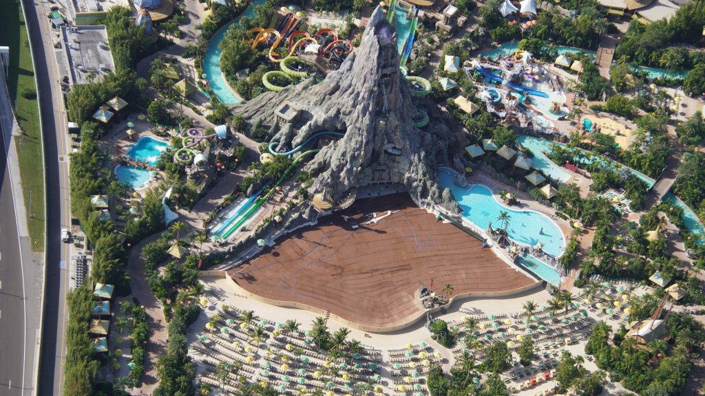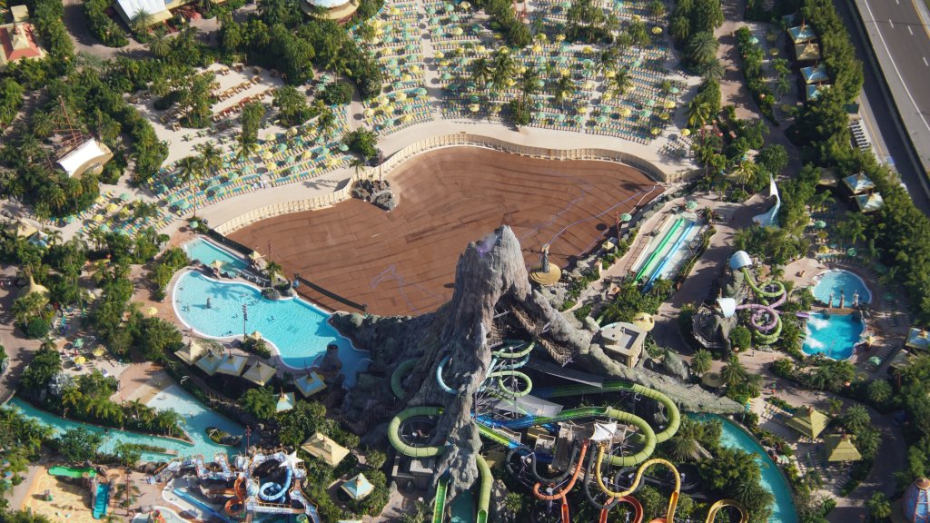 - Image #5: Aerial overview of Volcano Bay. Waturi Beach wave pool is covered in brown fabric during a refurbishment.