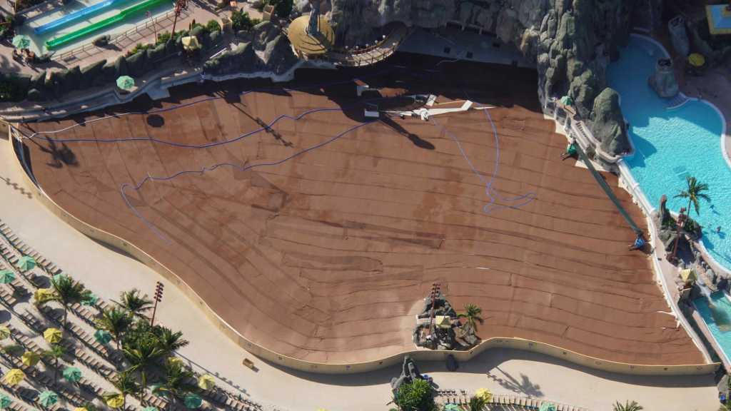 - Image #3: Aerial look at Volcano Bay. Fabric is covering the concrete floor of Waturi Beach wave pool.