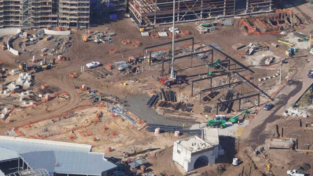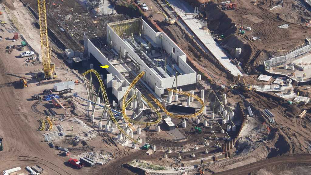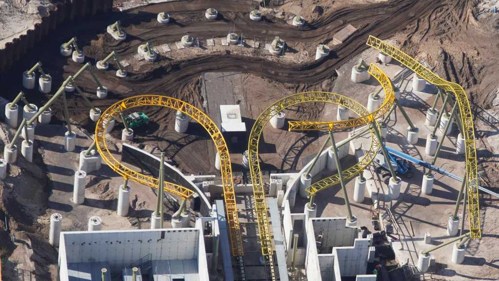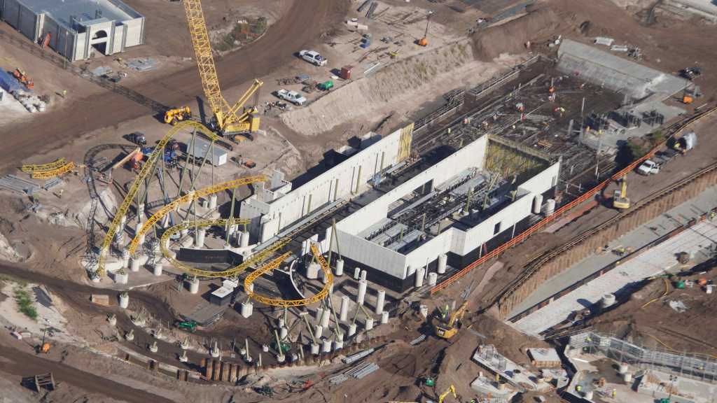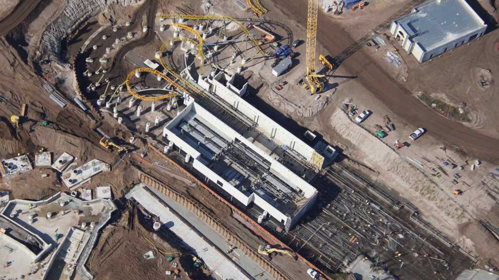 - Image #32: Aerial look at roller coaster footers and station construction in How To Train Your Dragon land. There’s track at top center, with 3 switches.