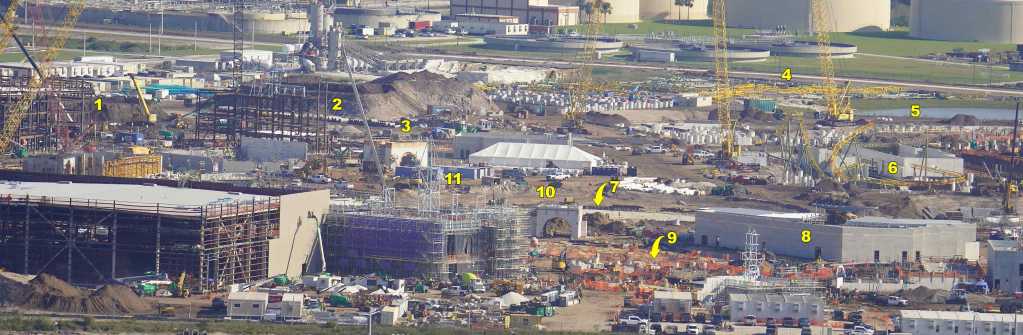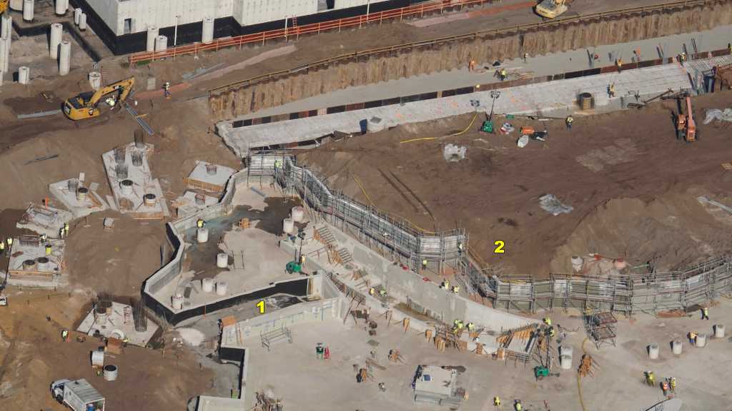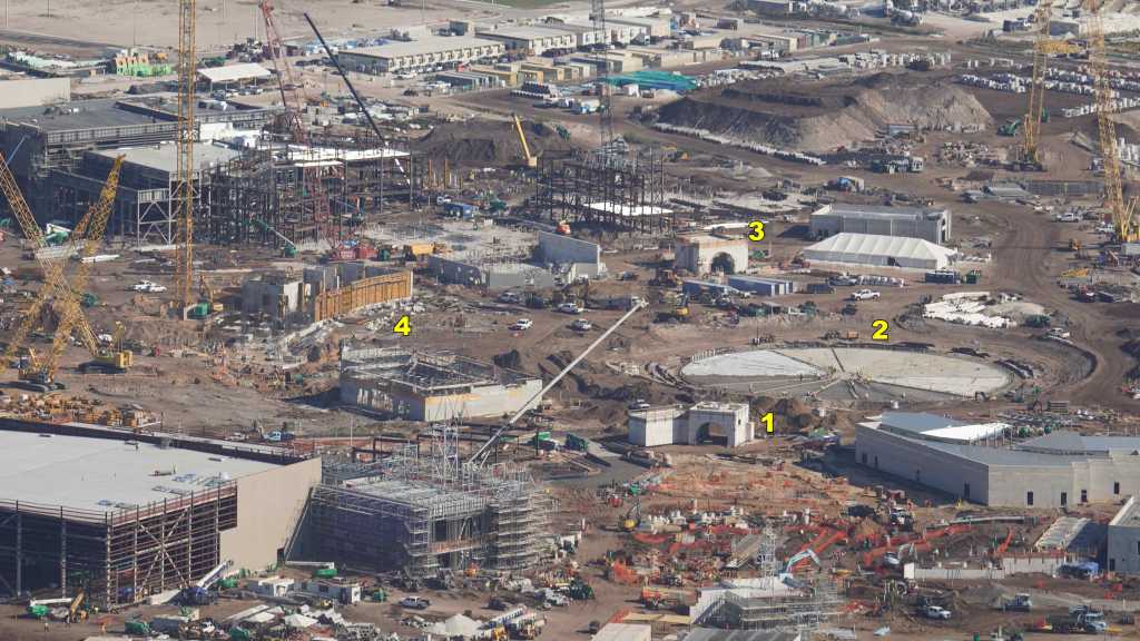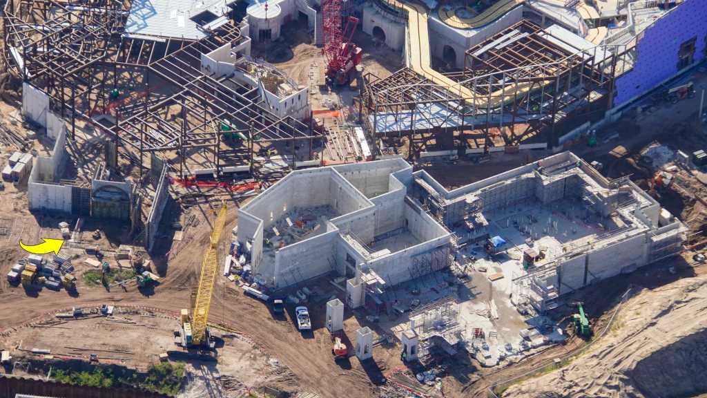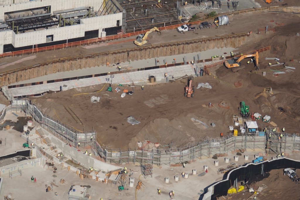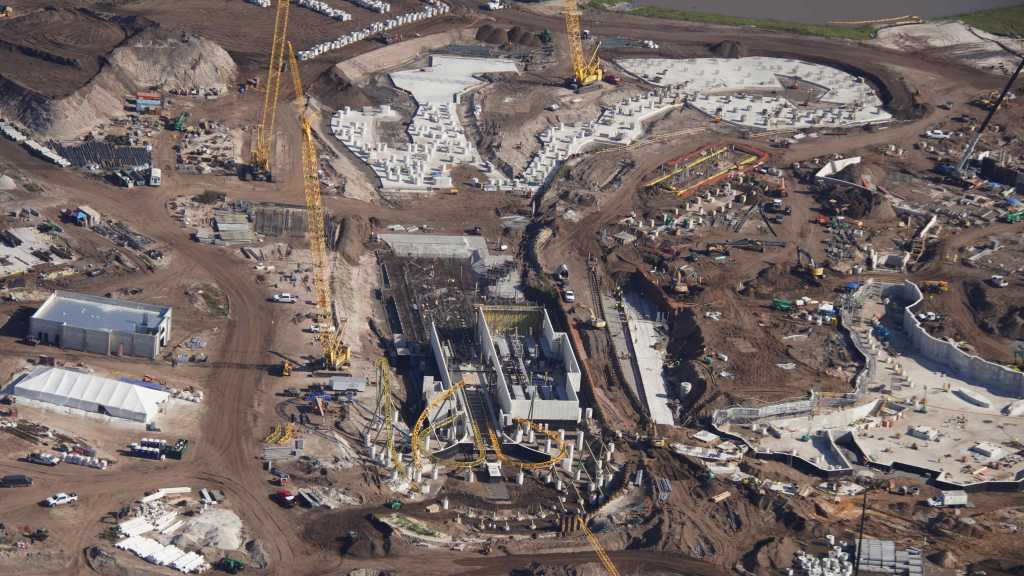 - Image #32: Aerial look at roller coaster footers and station construction in How To Train Your Dragon land. There’s track at top center, with 3 switches.