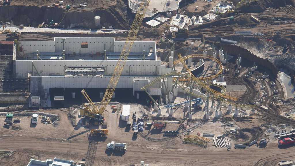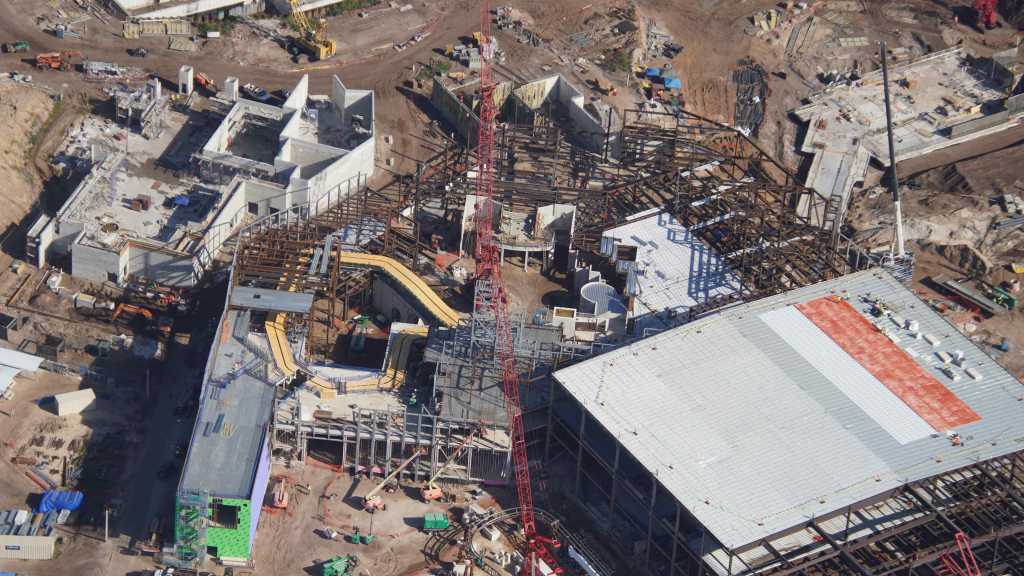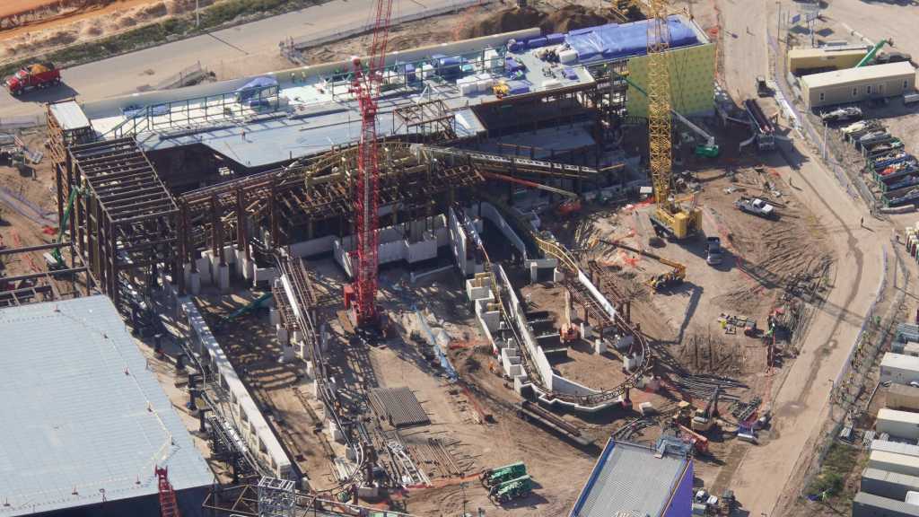 - Image #33: Aerial look at construction of the station and service bay of the How To Train Your Dragon roller coaster. Recently placed track, with switches, is at center.